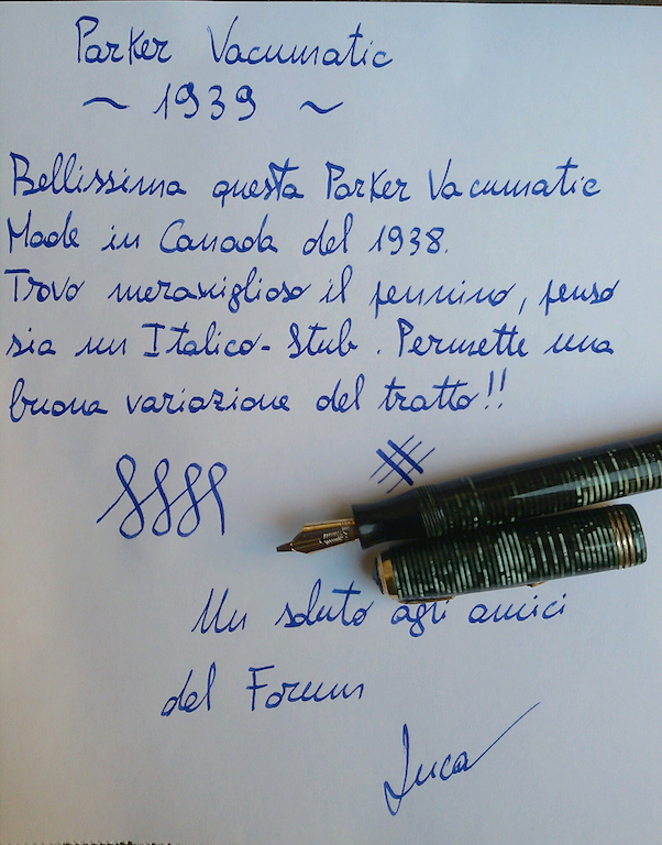Non sono un amante sfegatato delle Parker ma questa vacumatic, made in Canada del 1939 non potevo farmela scappare. La penna misura da chiusa 13,5 centimetri, ha un pennino a dir poco favoloso, penso sia uno stub/italico che dona una bellissima variazione di tratto. Ho di conseguenza provveduto al ripristino del sistema di caricamento speedline filler. Non ho trovato alcuna difficoltà nella rimozione del vecchio diaframma, della famigerata pallina e nel metterne uno nuovo pur non possedendo alcuno strumento specifico, sarà la fortuna del principiante? Appena terminato il rimontaggio ho caricato la penna con Waterman Serenity Blue e subito mi ha conquistato...Penso che ne verranno altre! Lascio spazio alle immagini.