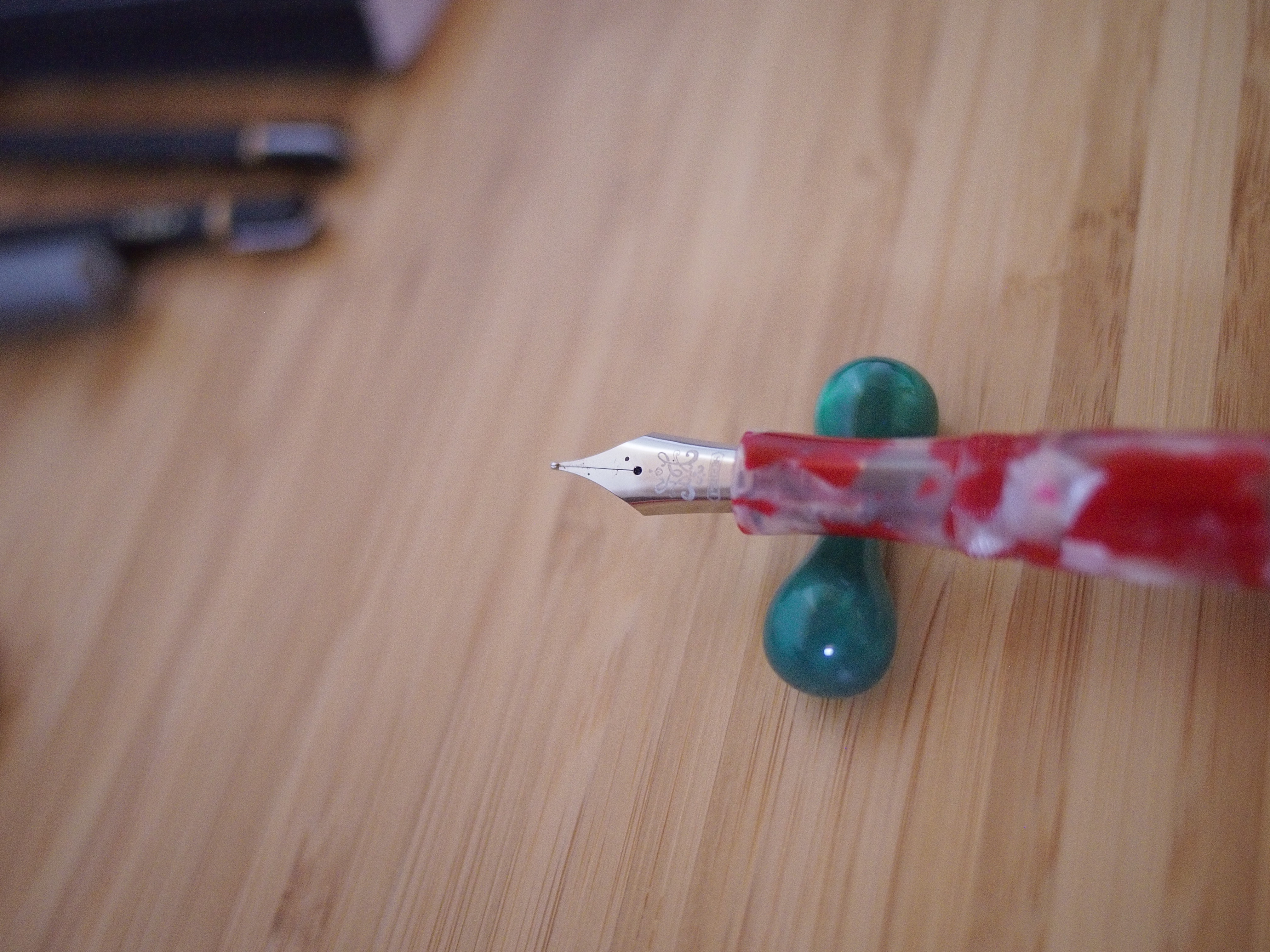 I pennini sono dei Waverly sottili in 2 casi (con la punta girata leggermente all'insù per capirsi) e un pennino standard a punta tonda nell'altro (la rossa). In generale le penne scrivono molto bene. Ho solo aumentato un po' il flusso su tutte. Nel caso del pennino a punta tonda c'era anche qualche lieve problema di false partenze, risolto in 5 minuti con del micromesh... nessun problema grave in ogni caso. Le penne in questione mi sono costate sui 18 euro l'una più spedizione (EMS) dalla cina. Per il prezzo veramente non si può chiedere di più e devo dire che non sfigurano anche vicino a penne molto più costose.
