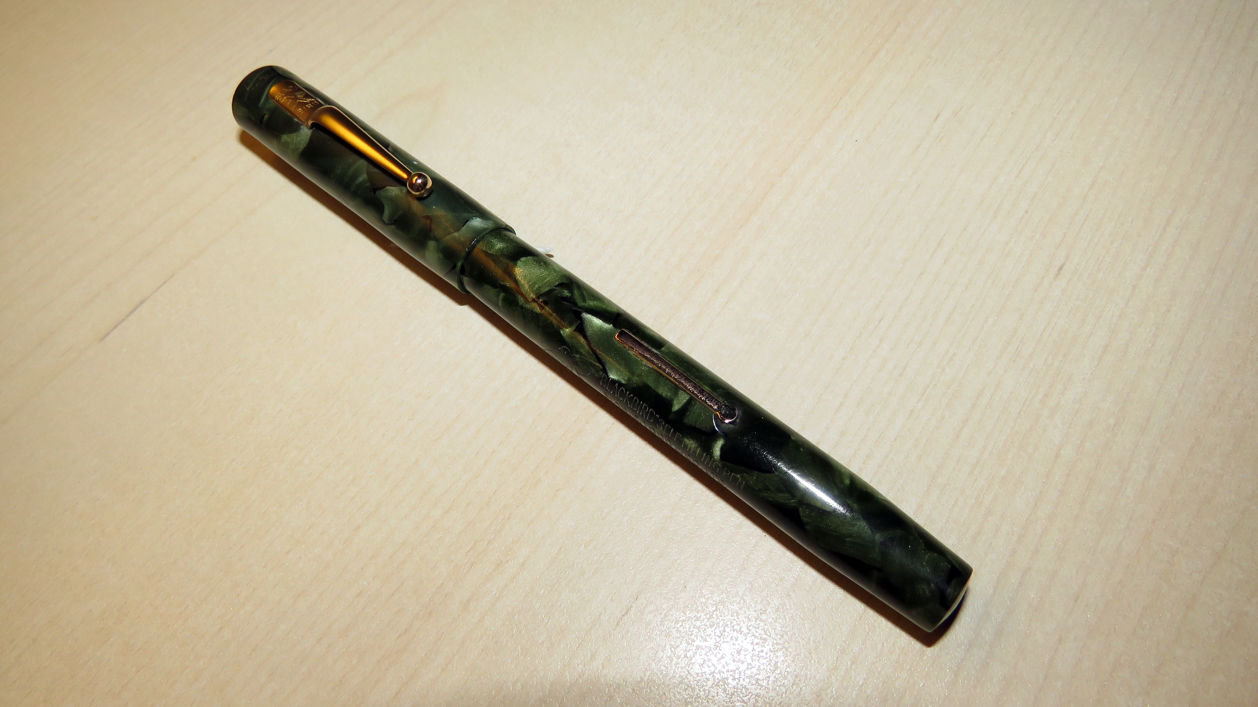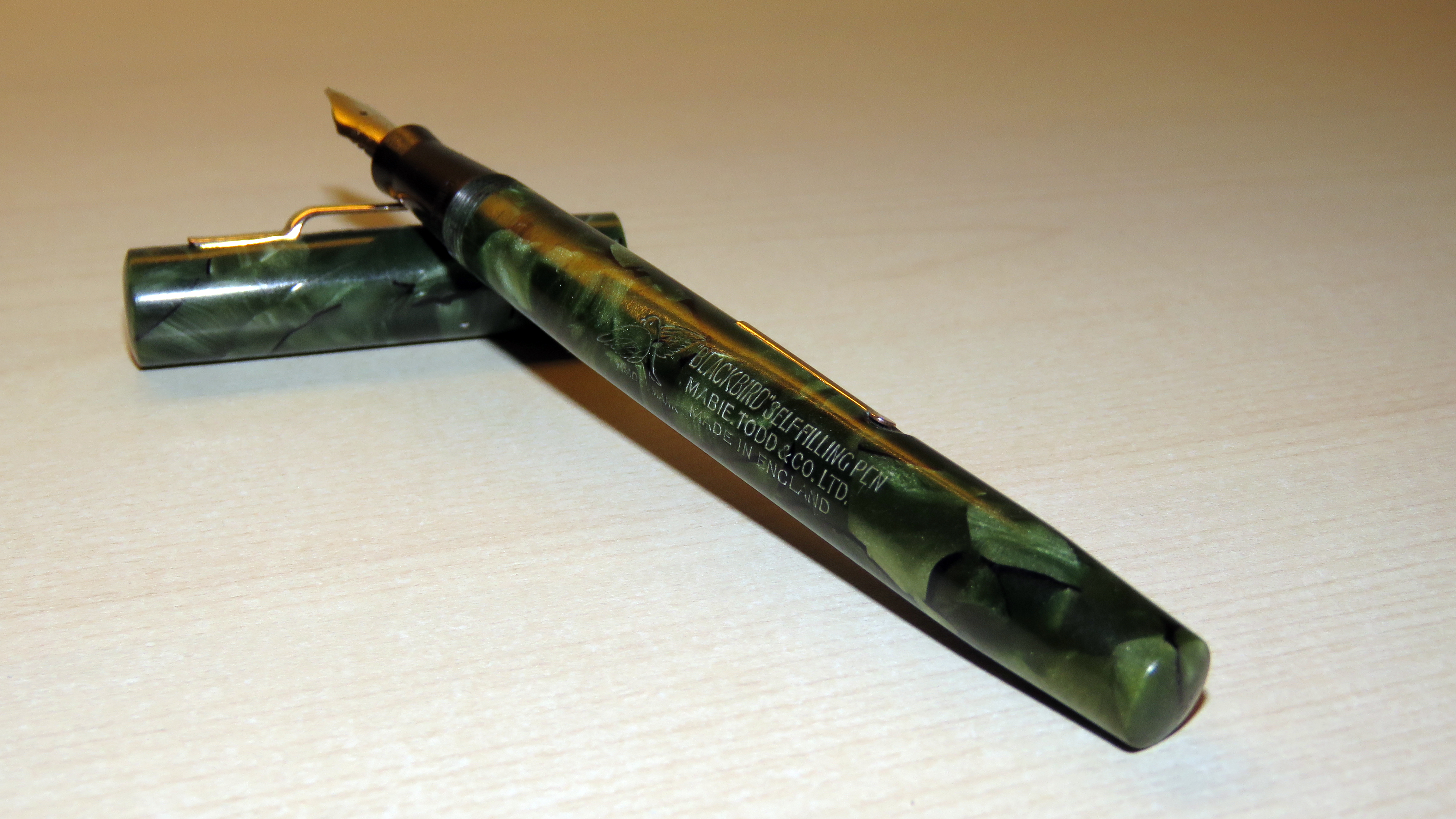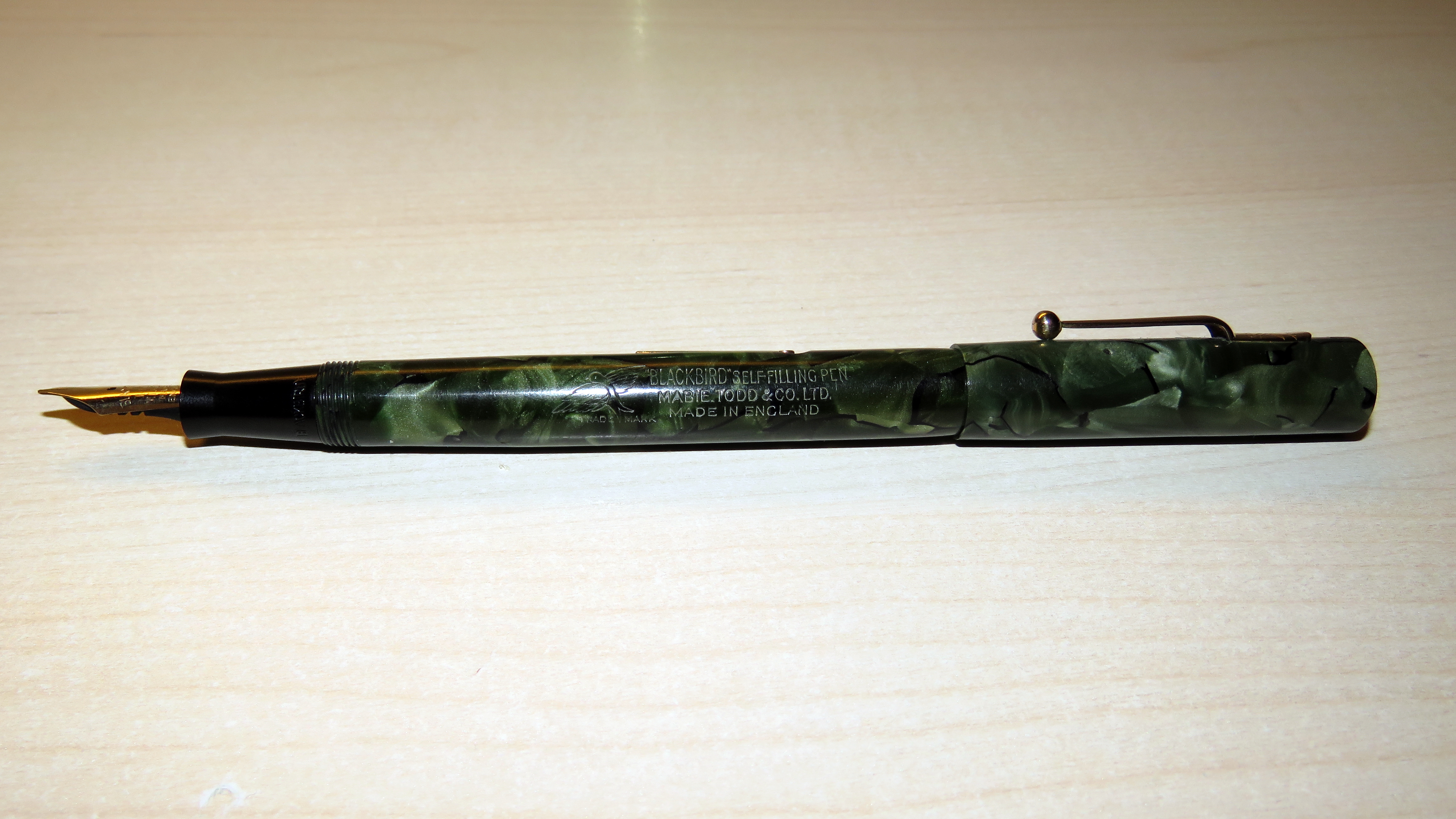 Eccone un'altra, una Blackbird di Mabie Todd nella celluloide classicissima che più classica non si può, verde marmorizzata.