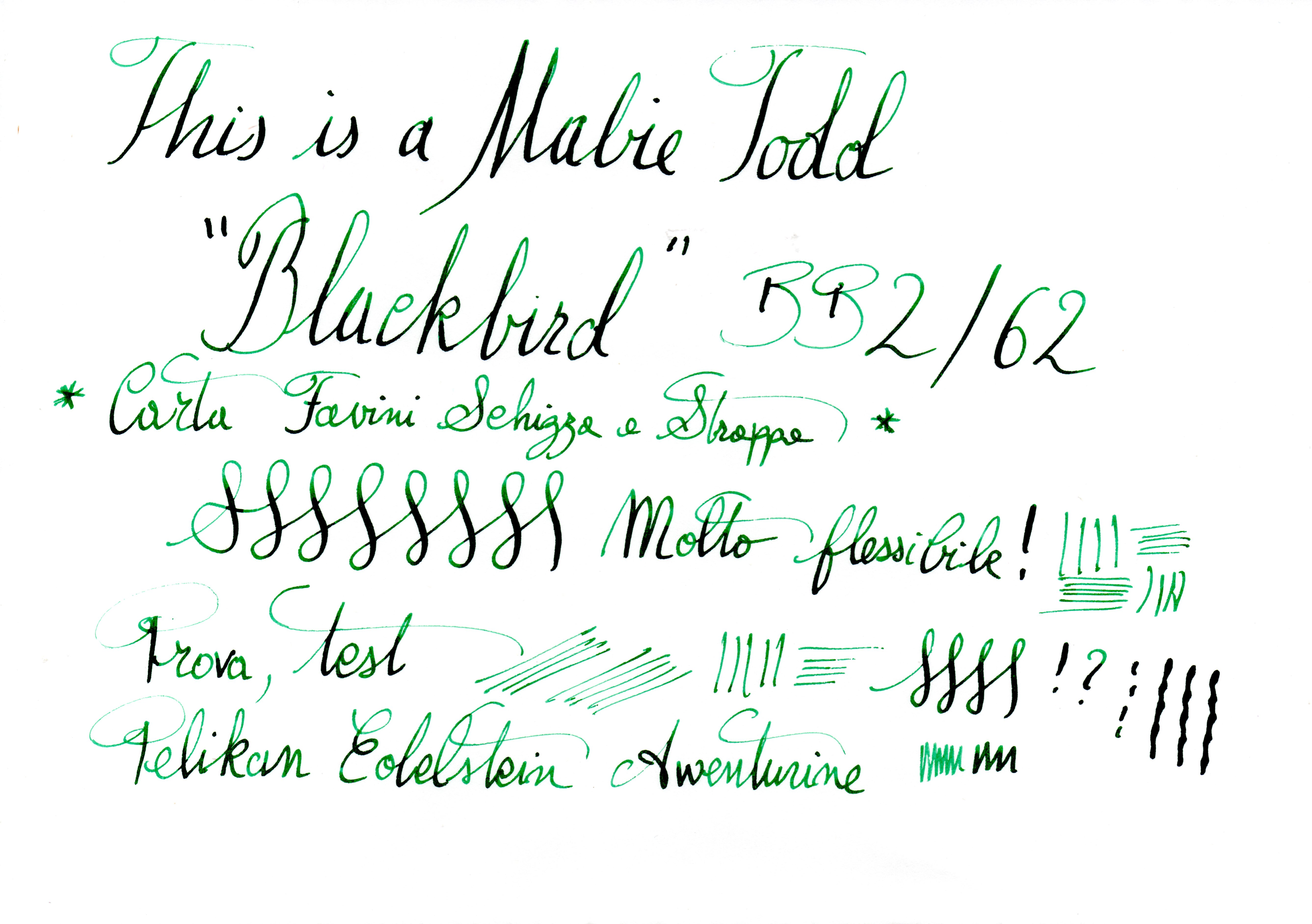 Il pezzo forte è il pennino, già sull'unghia si mostrava ben flessibile, ma è stata la prova su carta a confermarlo davvero. Per essere di dimensioni cosi piccole è molto morbido ed ha un ritorno rapidissimo. Sembra essere uno Oblique Stub - Italico, non sono pratico con questo tipo di gradazioni, e gratta un po', ma sono quasi sicuro che sia io a non essere capace ad usare un Obliquo.