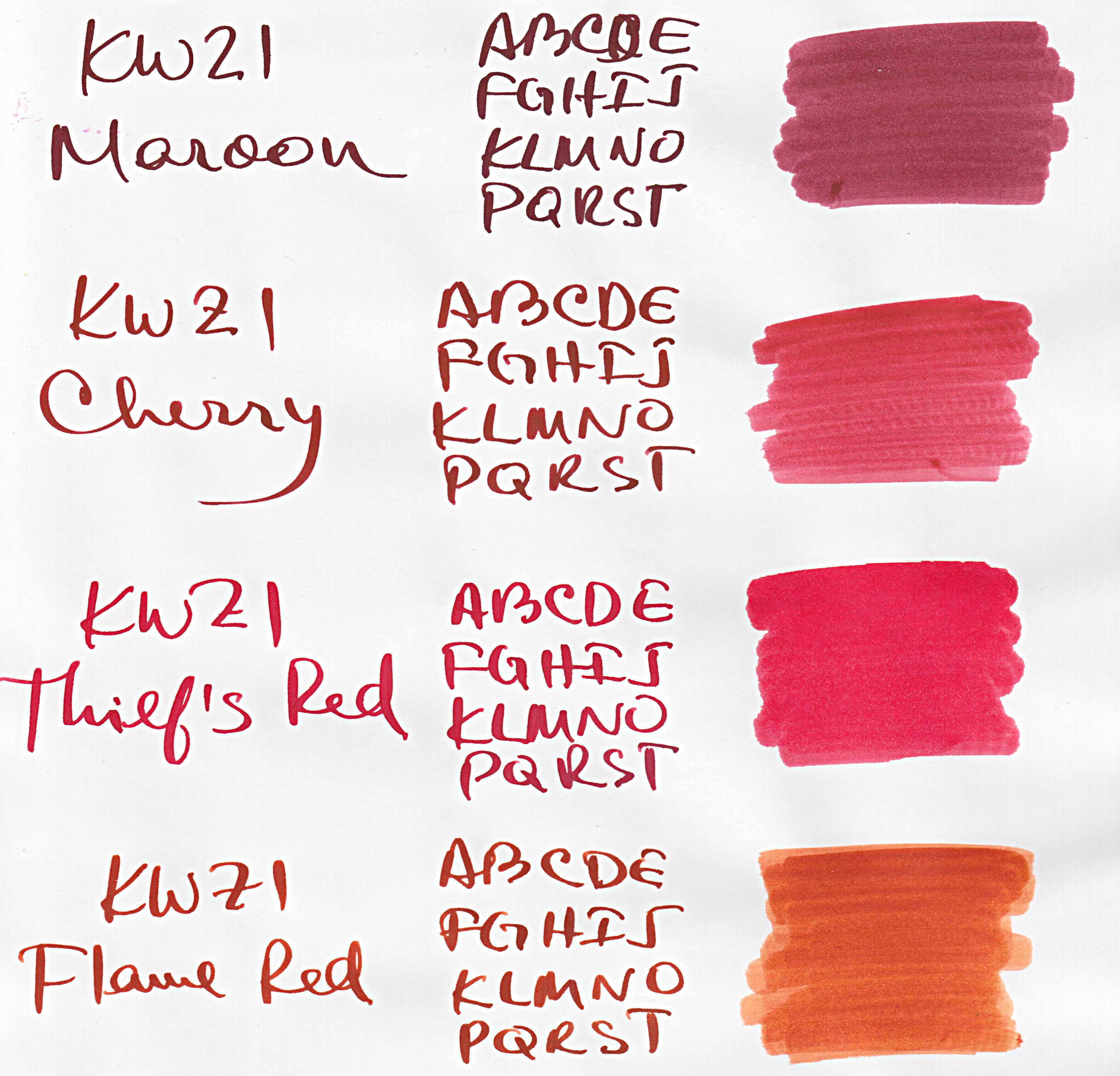 Nelle foto, i numeri di due cifre che vedete affiancati alla scritta "KWZI" fanno riferimento al vecchio indice di classificazione adottato da Konrad (da ignorare): provvedo a elencare in ordine, sopra ogni immagine, il nome corretto con numero identificativo corrente di ogni inchiostro.