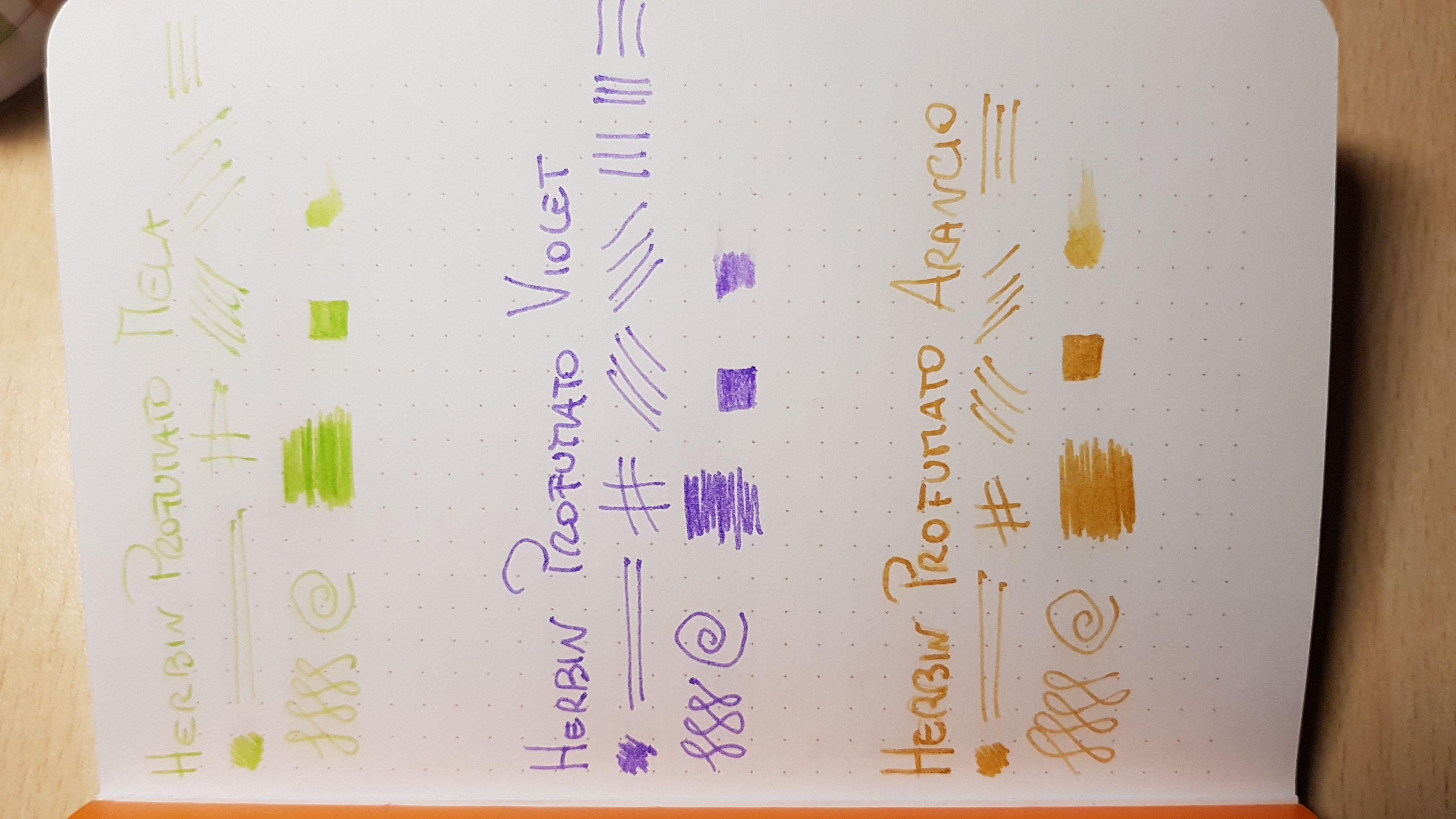 L'arancio non è tale, ma sembra un giallo senape, ed è l'unico che non mi sia piaciuto. Gli altri non mi dispiacciono. Vi allego una foto dal taccuino che uso per provare gli inchiostri.