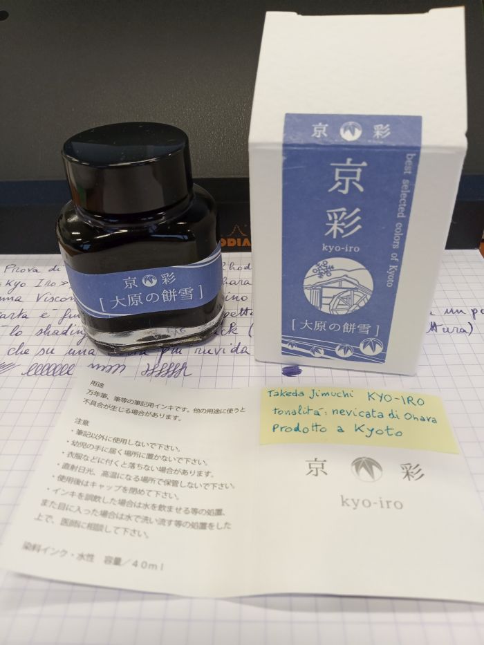 L'inchiostro che ho acquistato io ha una tonalità chiamata "Neve di Ohara" o "Nevicata ad Ohara": strana denominazione per un colore prugna/violaceo, ma forse si riferisce al colore plumbeo del cielo, o dell'acqua dei ruscelli, o dei tetti di pietra della cittadina, durante una nevicata. Comunque sia, la prova di scrittura ha dato i seguenti risultati: