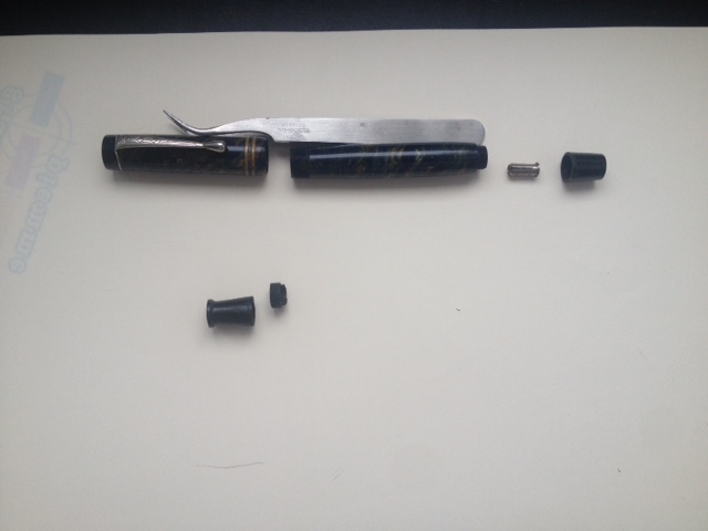 Quanto possa costare la riparazione è molto difficile da dirsi; la cosa più ardua è riparare la rottura sull'imboccatura ed un intervento del genere credo debba prevedere l'asportazione dell'intera parte filettata, la creazione di un incastro e la realizzazione di una nuova parte da trapianntare sulla penna. Quasi impossibile trovare del materiale dello stesso colore, ma anche se venisse fatto con celluloide nera la differenza si vedrebbe molto poco. Sono alcune ore al tornio da parte di uno specialista. Gli altri pezzi un riparatore ptrebbe averli, ma magari andranno adattati con ulteriore lavoro.