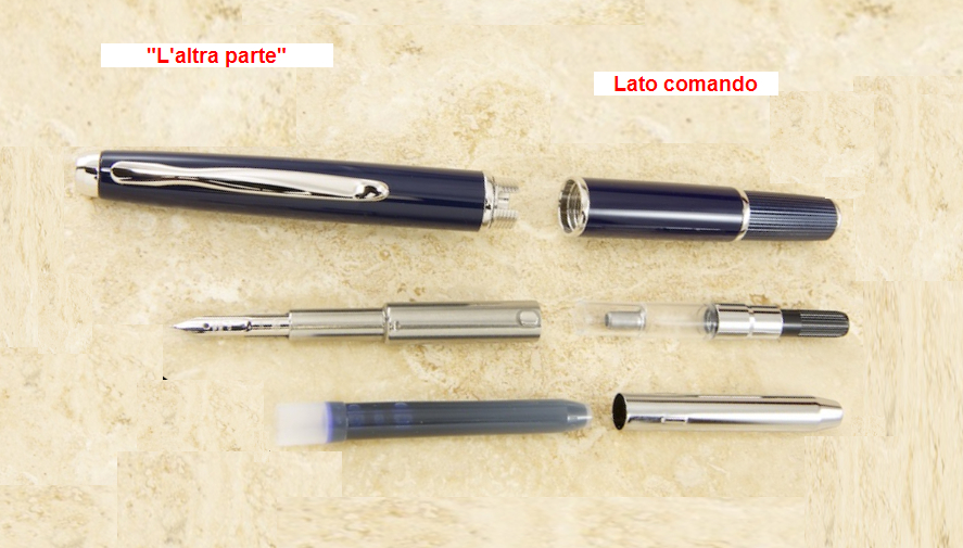 Ho diversi gruppi pennini della Caples stilo, per cui mi interessava il fusto, dall'immagine che hai messo si tratta del "lato comando" e "l'altra parte",rolex hunter ha scritto:Dato che non ha cappuccio, il fusto è in realtà diviso in due parti (quella con il comando di uscita del pennino, e "l'altra"); preventivamente ti dico che lo vedo difficile; comunque a te quale parte serve acquistare?? (foto dalla rete, modificata)