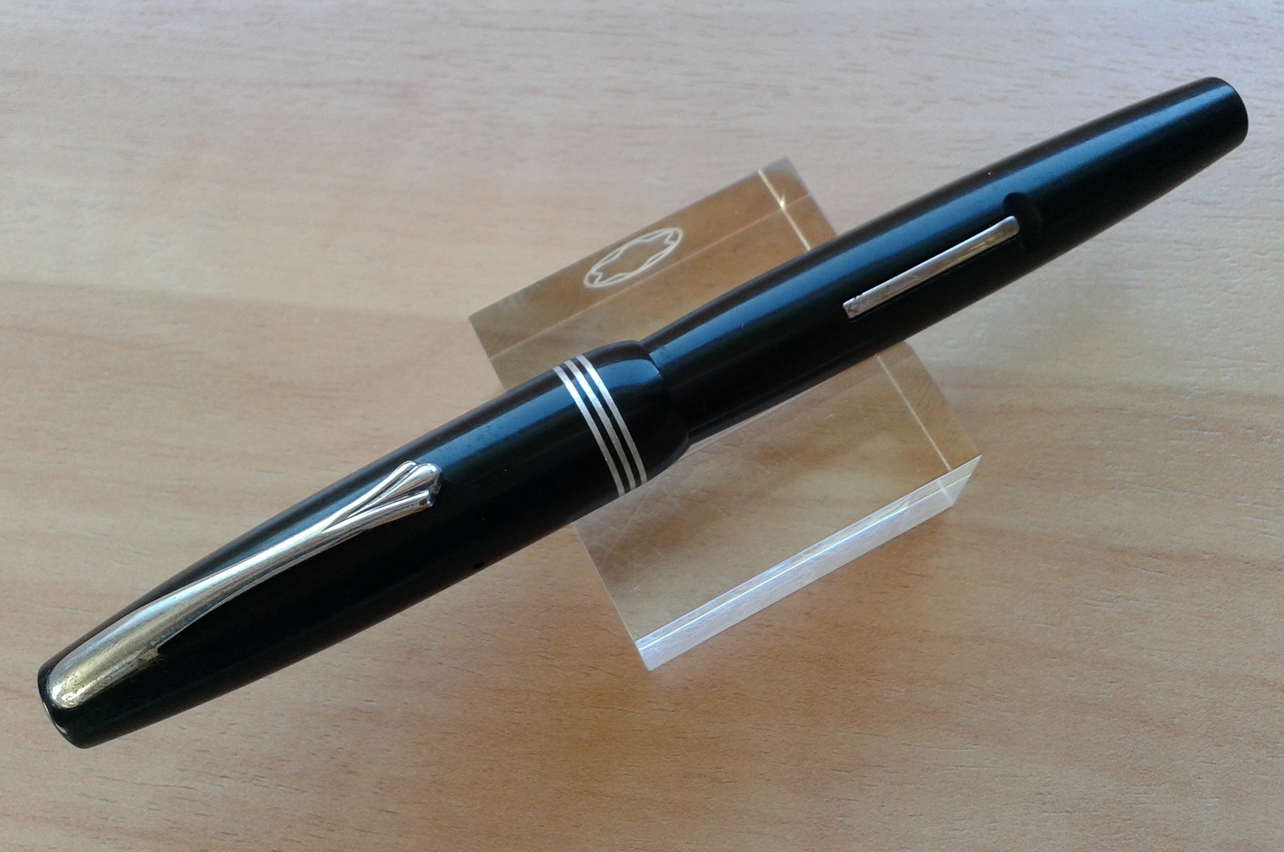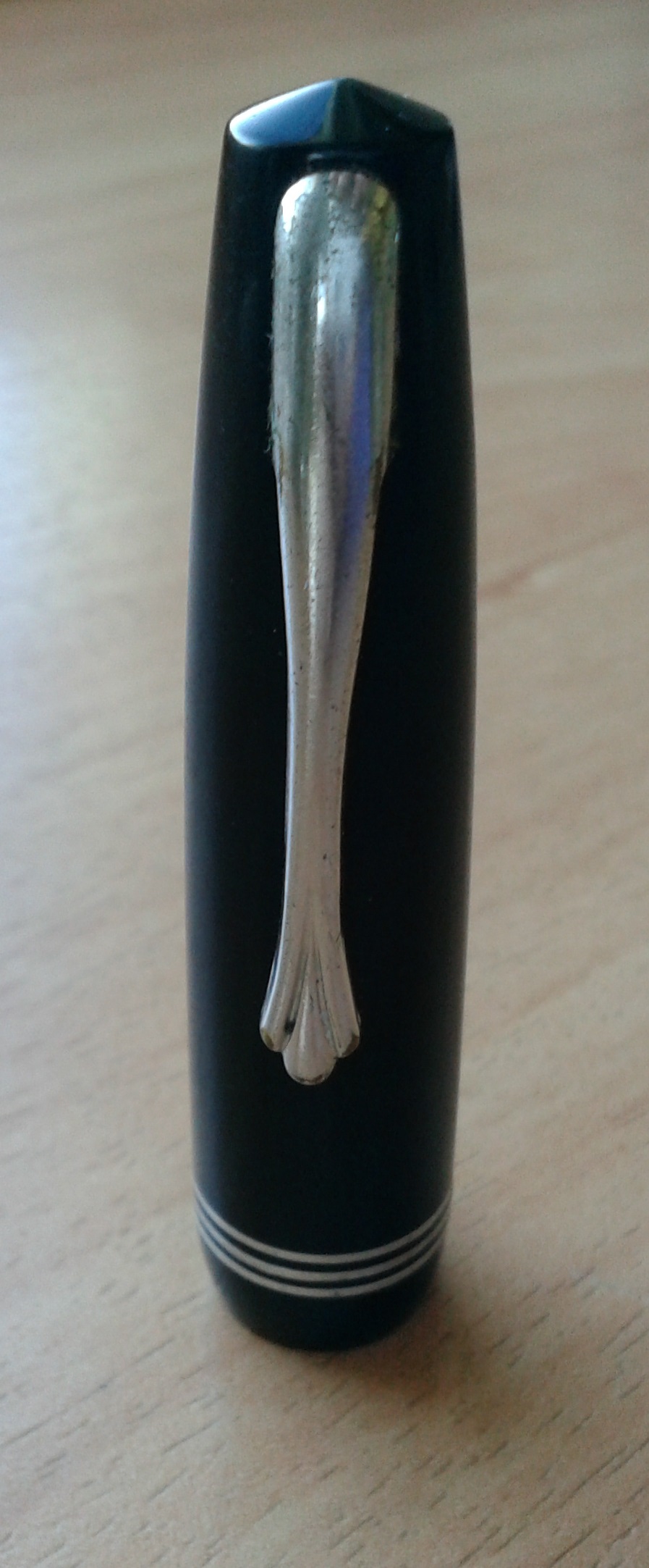 Le parti metalliche, che ora appaiono di metallo bianco, potrebbero essere state dorate in origine: la clip (dove si nota un residuo di doratura) e gli anellini (che parrebbero addirittura in alluminio) sul cappuccio quindi, oltre a pennino e levetta di caricamento, potrebbero avere ricevuto una placcatura talmente leggera da essere repentinamente svanita per semplice strofinamento...