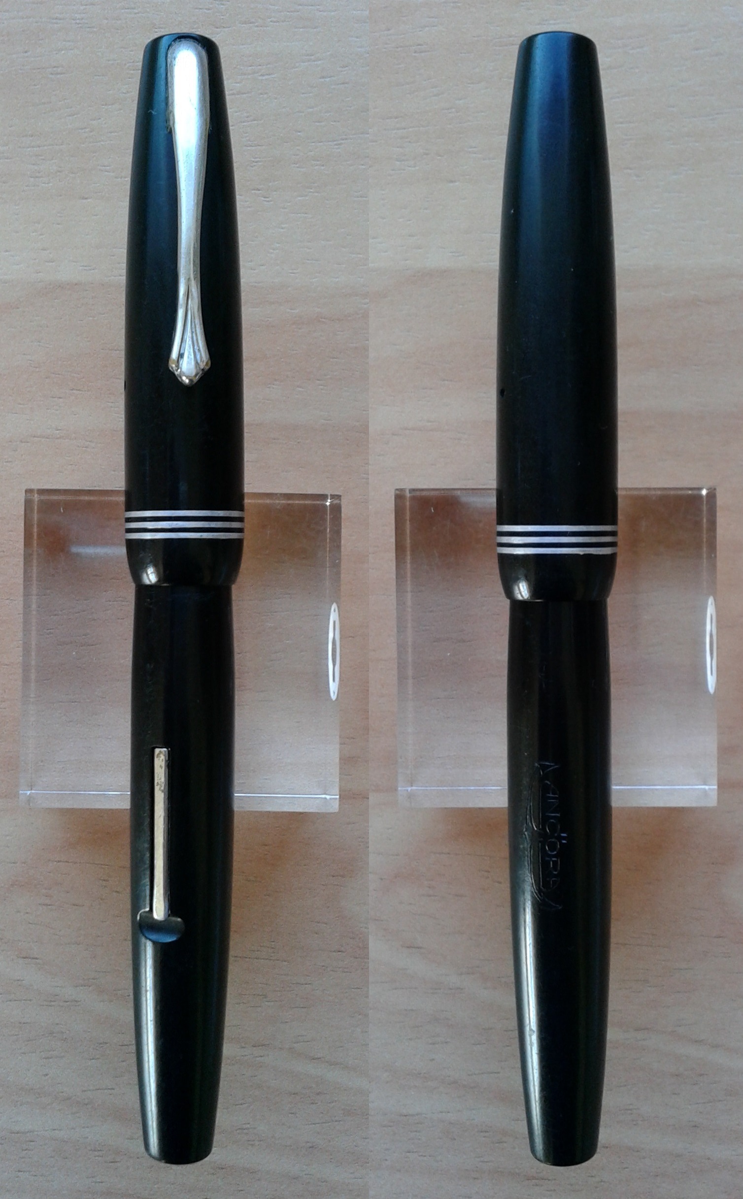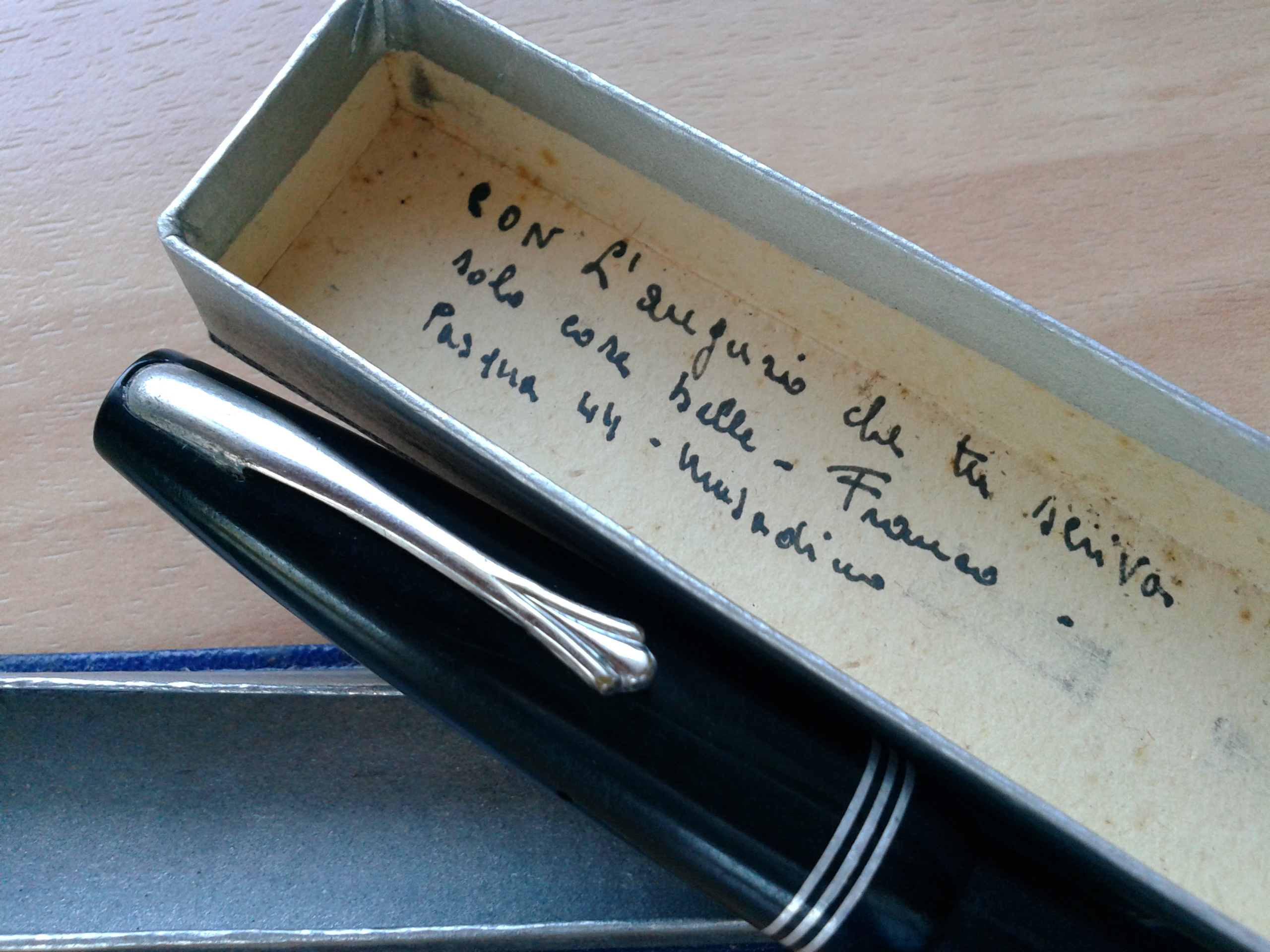 Dopo aver atteso invano per oltre un anno di imbattermi in un pennino Ancora in acciaio (commercialmente chiamato "Zanio"), ho deciso di presentare comunque la penna con un ritrovamento della scorsa settimana, poichè le probabilità di trovare un pennino corretto in condizioni decenti sono assai scarse, e il premio del ritrovamento, forse, potrebbe non essere la qualità di scrittura. Aspetterò ancòra