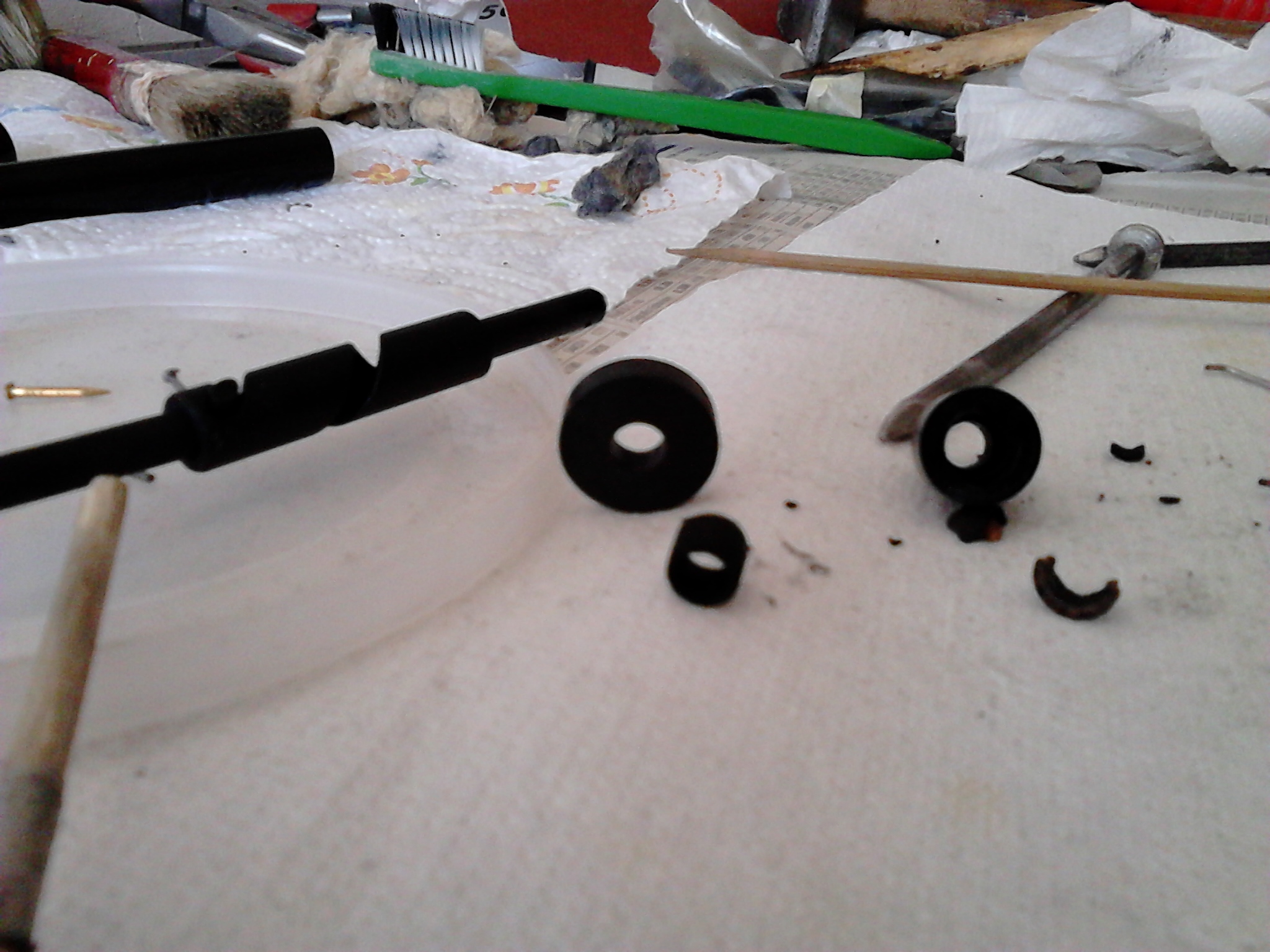 Bravo, lavoro ottimo, del quale peraltro approvo totalmente anche l'utilizzo di candeggina e grasso siliconico. Non però quello della gomma, visto che praticamente la stessa tecnica che hai utilizzato potevi applicarla al sughero e realizzare una boccola come l'originale.