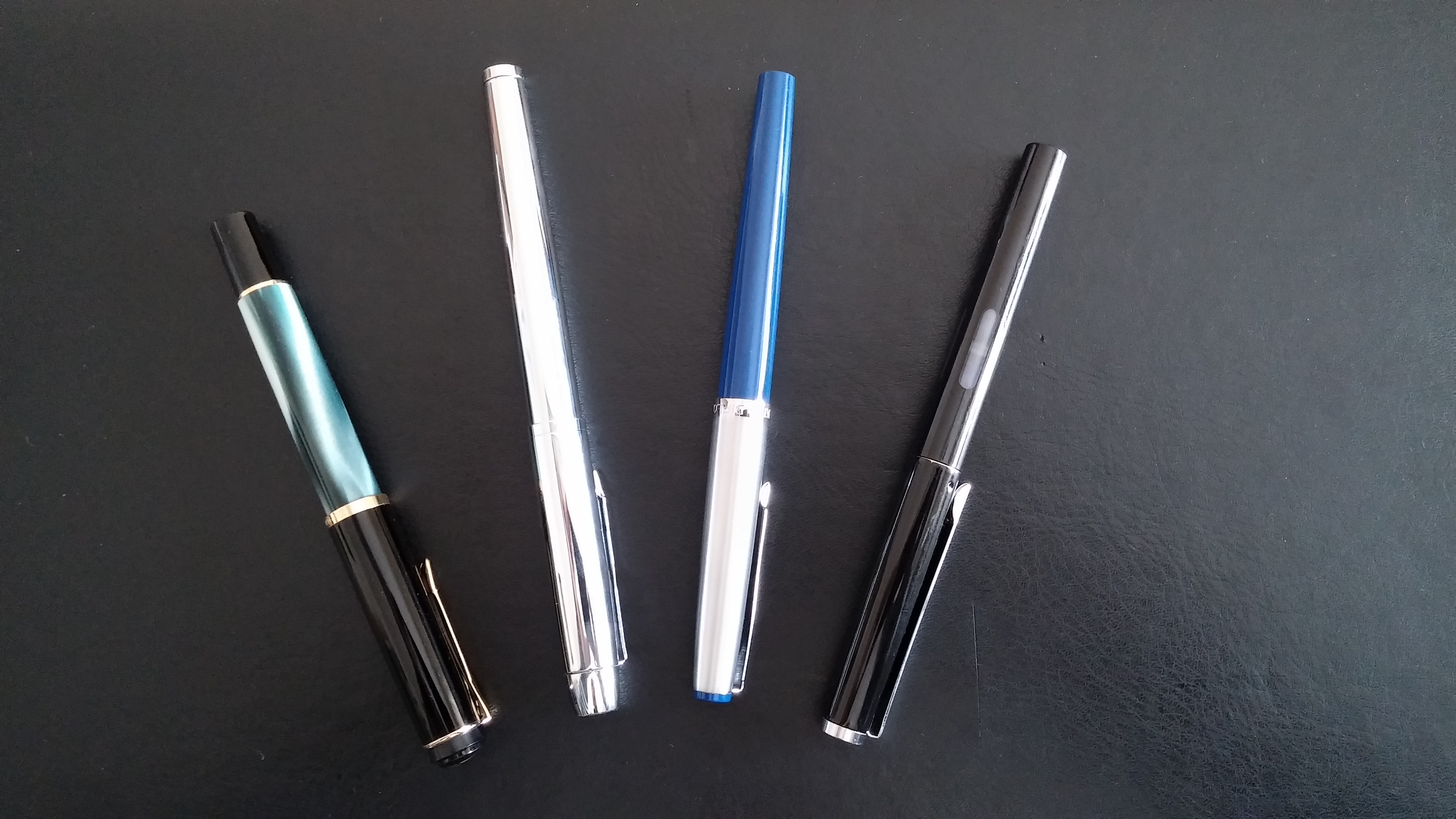La quarta è una Pelikano con cappuccio in metallo, edizione 1993. La comprai all'epoca per nostalgia di quella con la quale avevo imparato a scrivere, andata purtroppo persa. Fa ancora egregiamente il suo dovere.