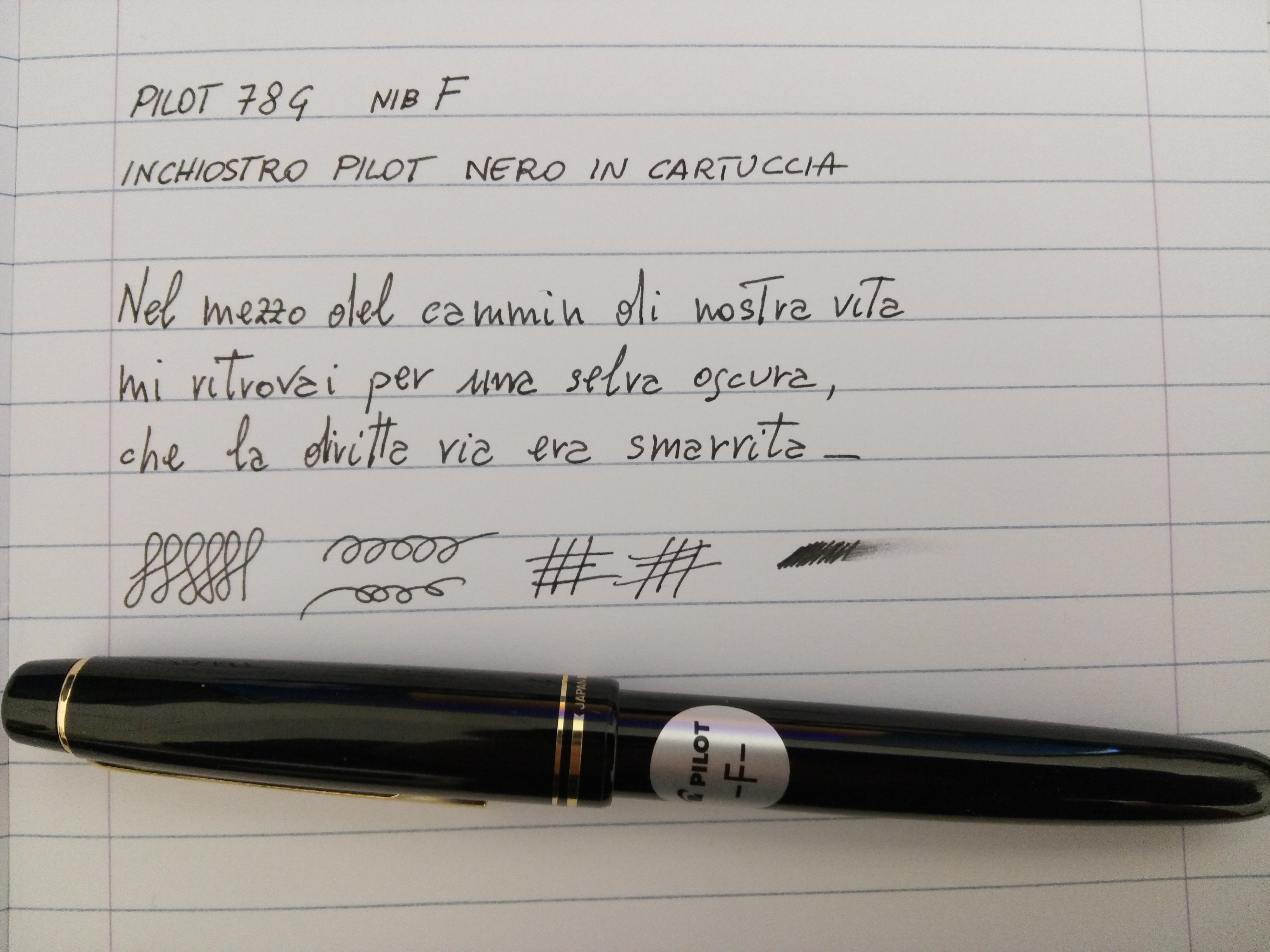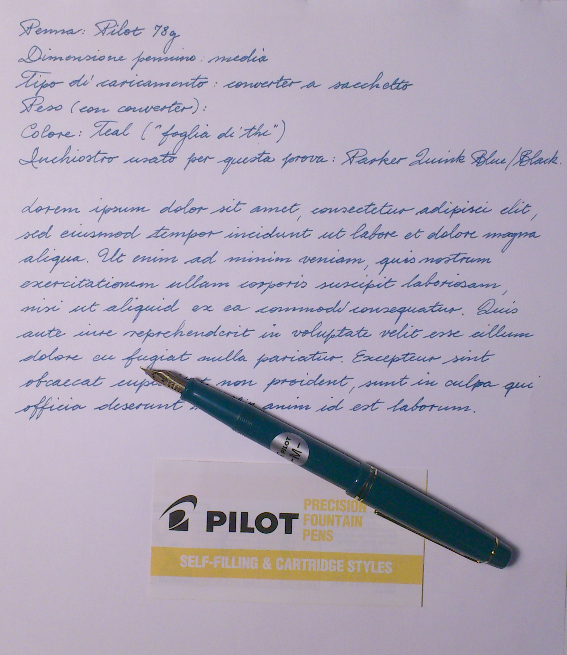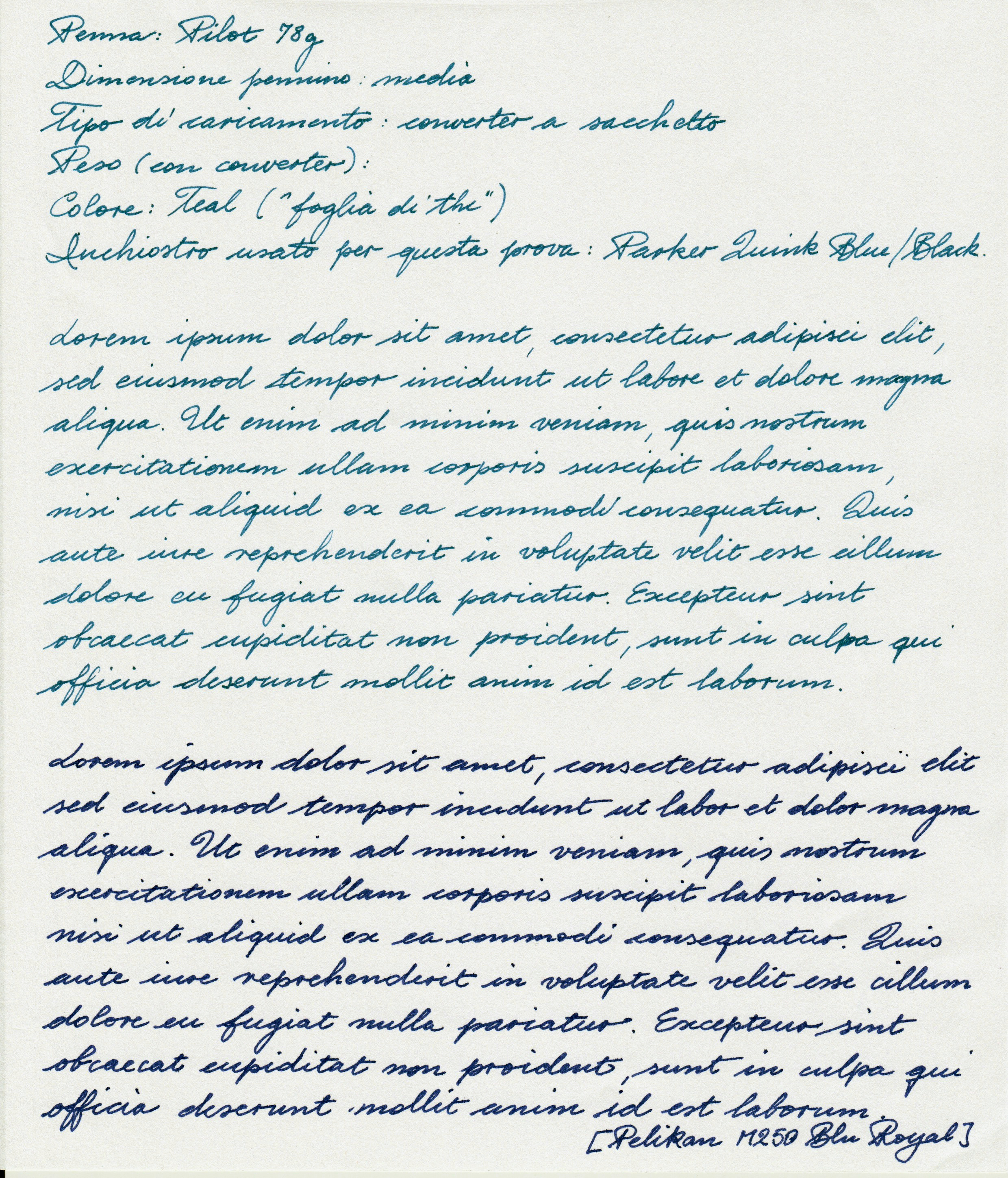 Tanto per dare un'idea visiva della differente "interpretazione" dei pennini tra occidentali e orientali, ho scritto sotto lo stesso testo con la Pelikan M250. Anche se l'inchiostro è diverso (la M250 ha il Blu Royal, la 78g il Parker Quink Blu/nero), si può comunque ben percepire come il pennino "M" della Pilot sia di fatto più fine del pennino "F" della Pelikan!