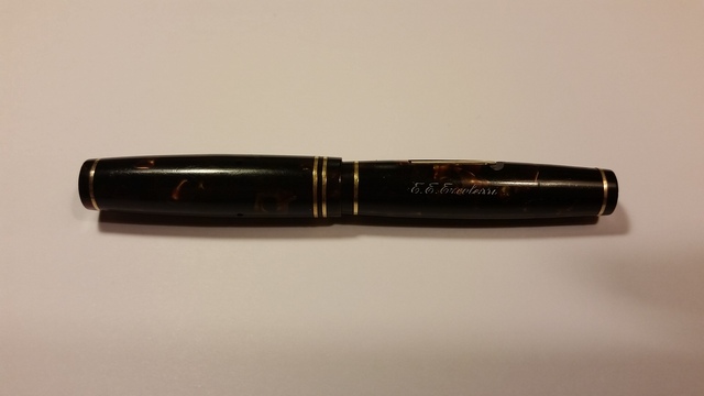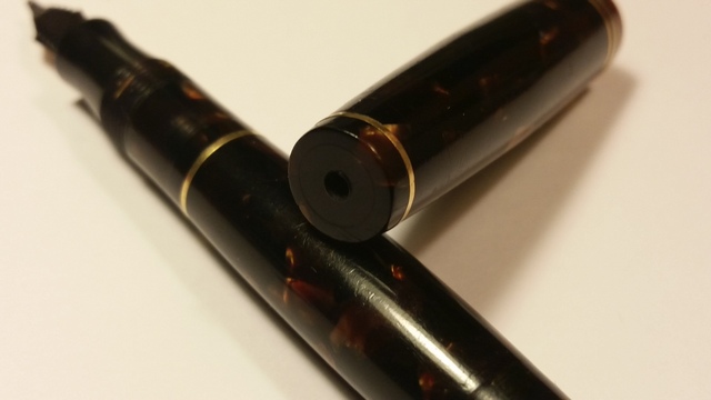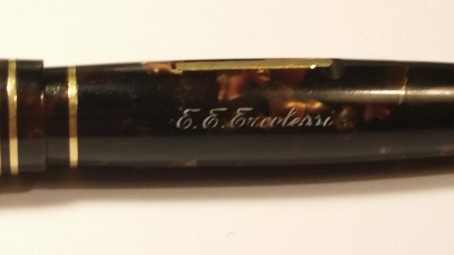Poche ore fa, mentre tornavo a casa, mi sono imbattuto in un negozietto dell'antiquariato, dove ho scovato, tra le cianfrusaglie, questa meravigliosa pennetta. Lunga chiusa 10 cm, questa piccina è marchiata E.E.Ercolessi, il più storico e famoso negozio di articoli da scrittura di Milano. Fondato nel 1921 (da Edgardo e Elvira Ercolessi), questo negozio è stato per moltissimo tempo il negozio di riferimento per tutti i milanesi. Ancora oggi, seppur di meno, è molto conosciuto, anche se ha perso un po' quel suo vecchio bagliore che lo ha reso così famoso. La penna ha un caricamento a levetta, il corpo e il cappuccio sono in celluloide marrone con dei riflessi meravigliosi (dalle foto che allegherò non si riesce bene a distinguerle). Il pennino originale, molto spesso, è in oro 14 carati. L'anellino sulla sommità del cappuccio, che credo servisse per farci passare un nastrino o una catenina, è purtroppo assente. Mi hanno particolarmente incuriosito le molte verette (ben 5) sia sul corpo che sul cappuccio. Ho ravvivato le incisioni con l'Uni Posca bianco. Purtroppo in rete non ci sono informazioni sulla produzione di stilografiche da parte dell'Ercolessi (sul wiki ho trovato preziosi informazioni) e quindi non riesco ad identificarne il modello. Vi allego in aggiunta qualche foto: