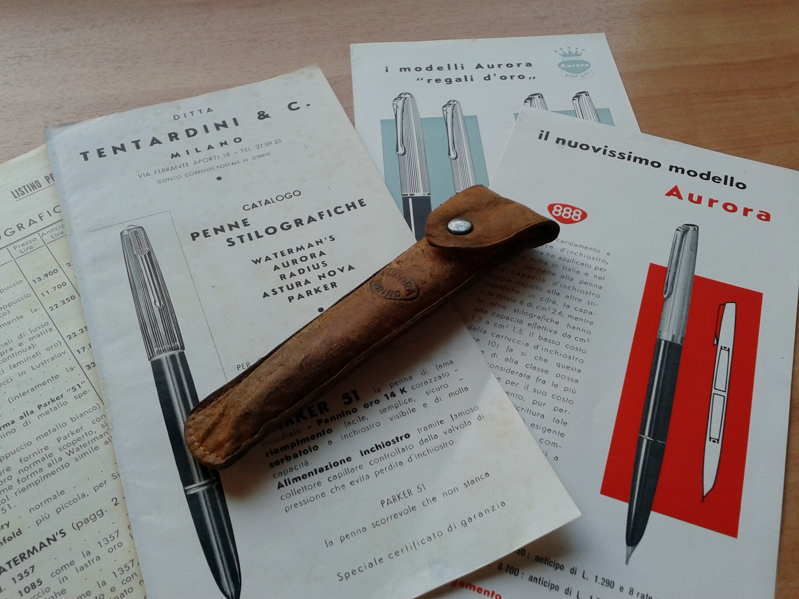 Beh, Nicolò, ti dirò soltanto che a far compagnia alla padrona di casa (ovviamente una stilografica Aurora anni 1930) si trovava, per ragioni di accostamento cromatico di celluloidi e dorature, uno splendido esemplare di portamine KAWECO in celluloide marmorizzata rossa, marchiato sul fusto