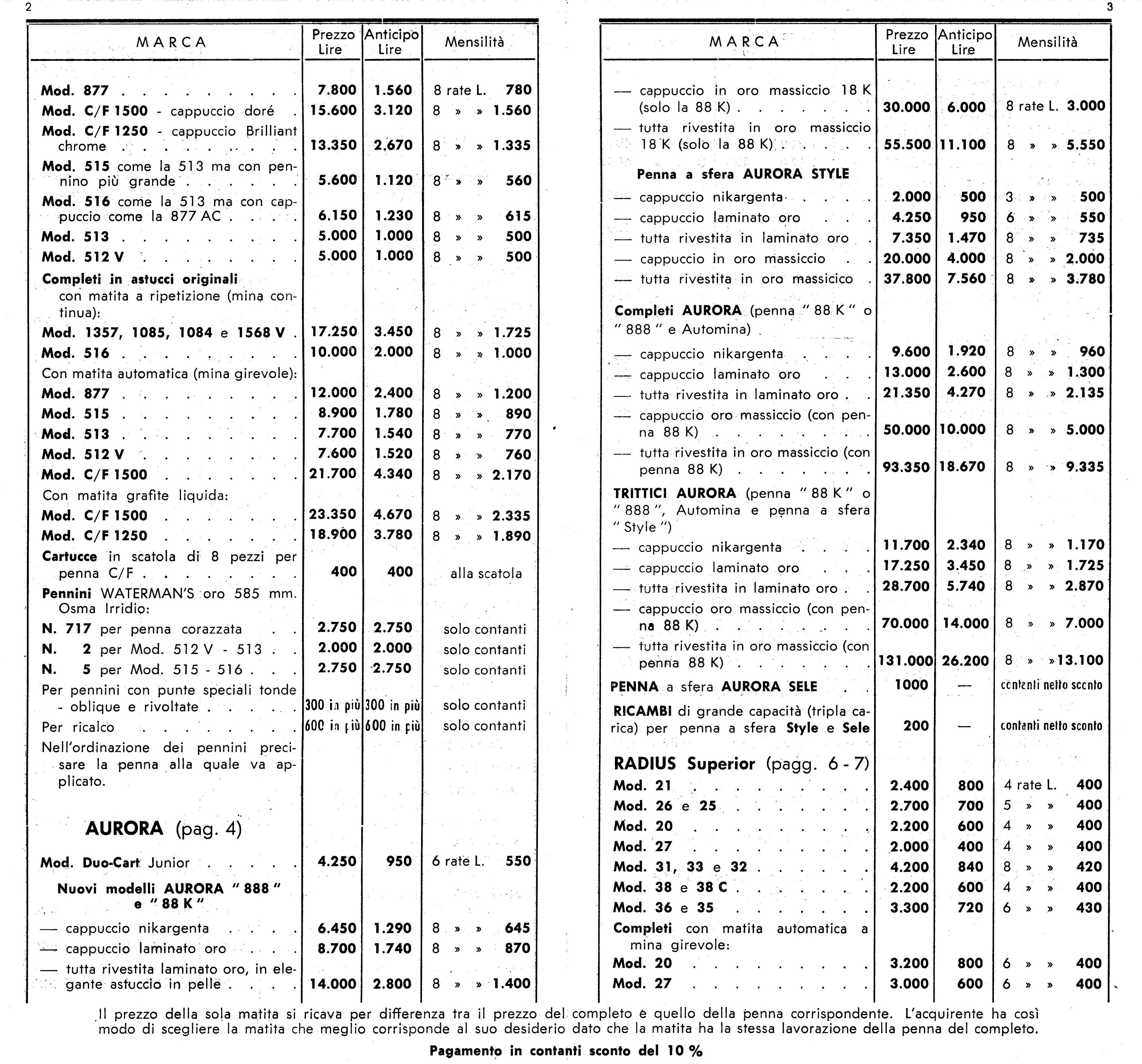 che riporta penne stilografiche disegnate in grandezza naturale con i relativi prezzi in un foglietto allegato.
