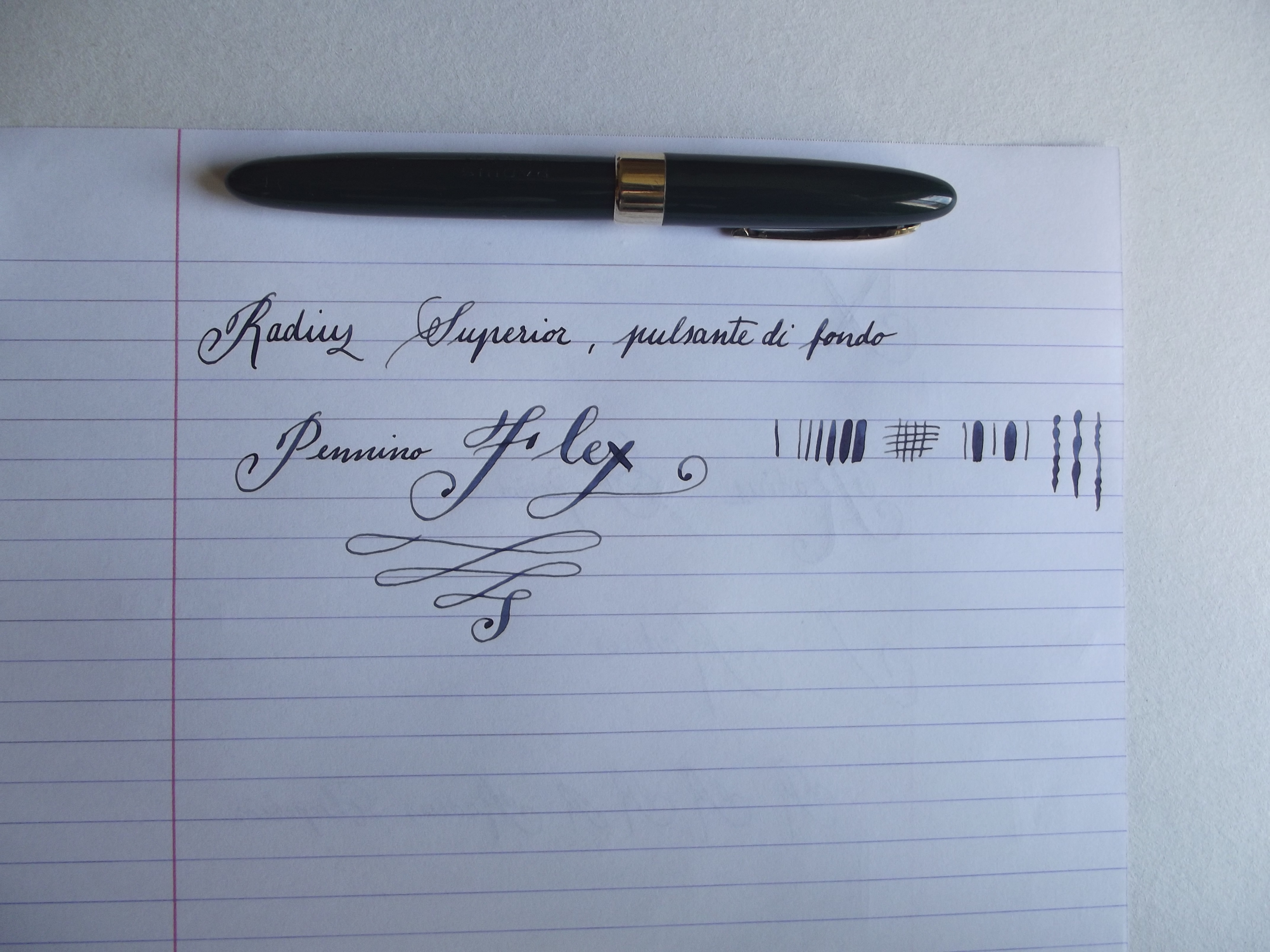 Grazie ad un amico che riesce a trovare il tempo per andare a mercatini, ho scovato qualche pennuccia italiana d'antan, tra cui proprio una Radius Superior. Nel mio esemplare, l'alimentatore è trasparente, e il pennino... guardate la prova di scrittura!