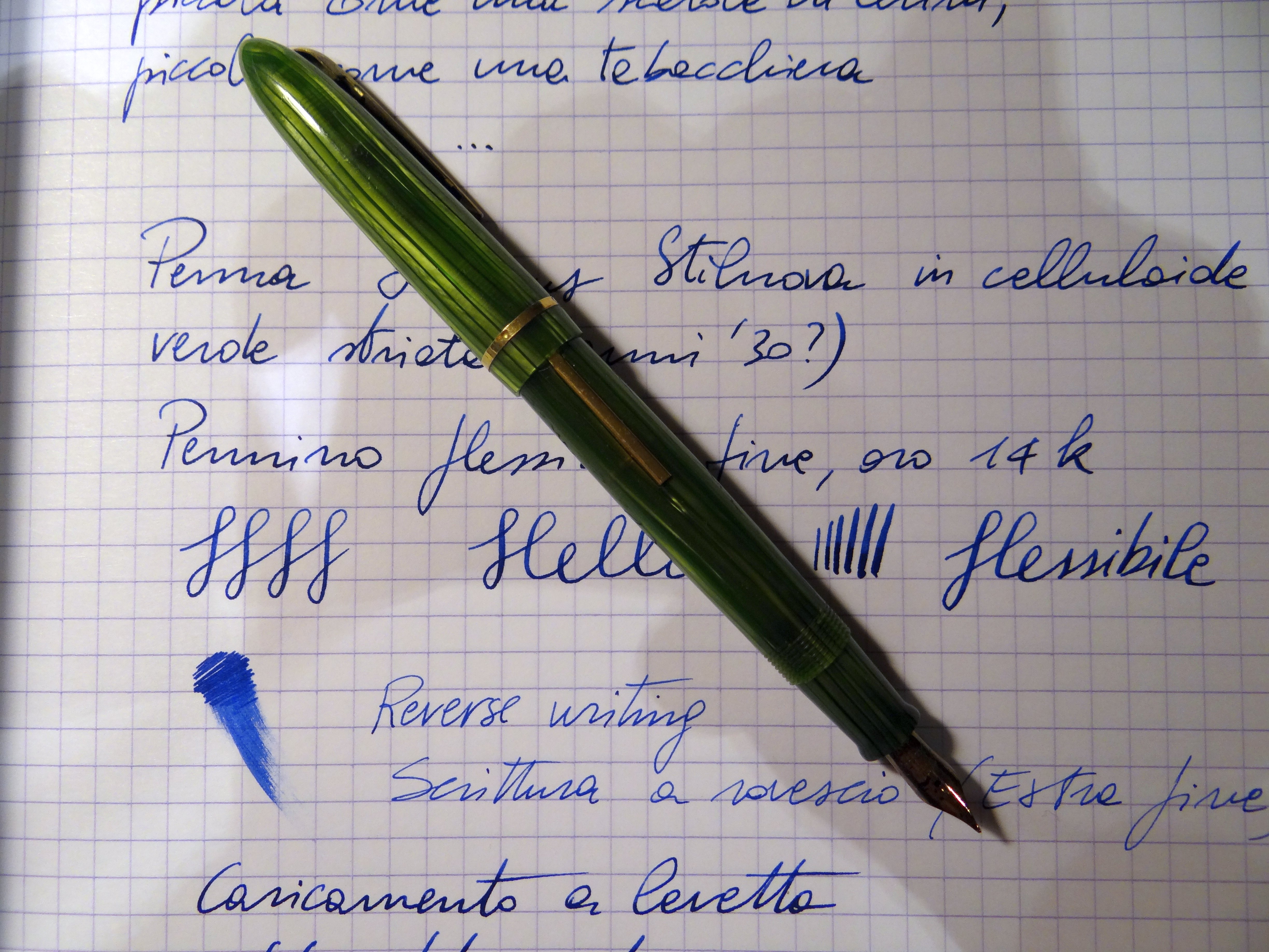 Le dimensioni sono compatte: 12,8 cm chiusa e 11 senza cappuccio. 14,4 cm calzata. Il pennino in oro 14 k è un fine flessibile che arriva a un BB. Scrive in modo piacevole, con un tratto fine ma piuttosto fluido, senza false partenze o incertezze, con in più il divertimento del pennino flessibile.