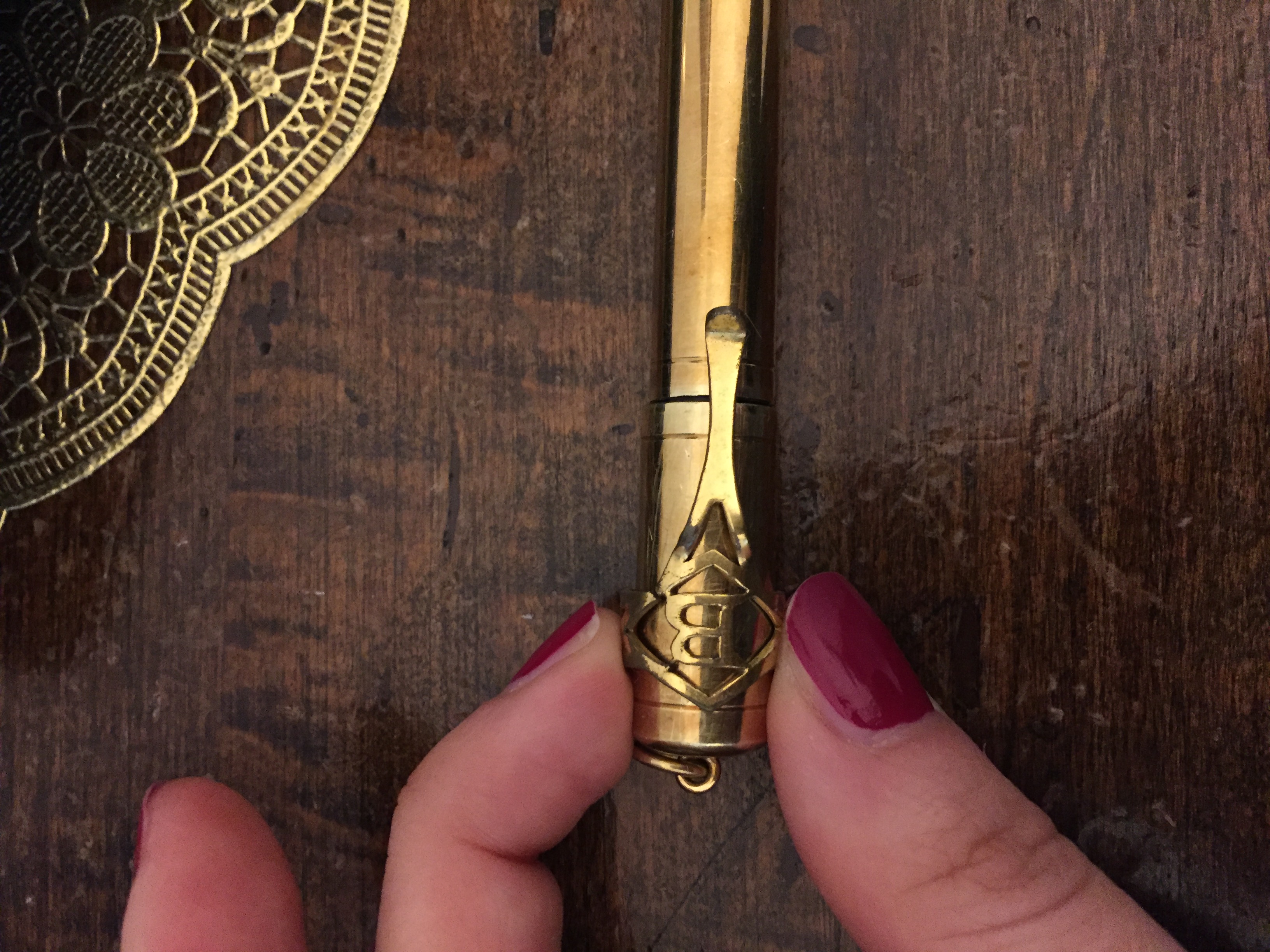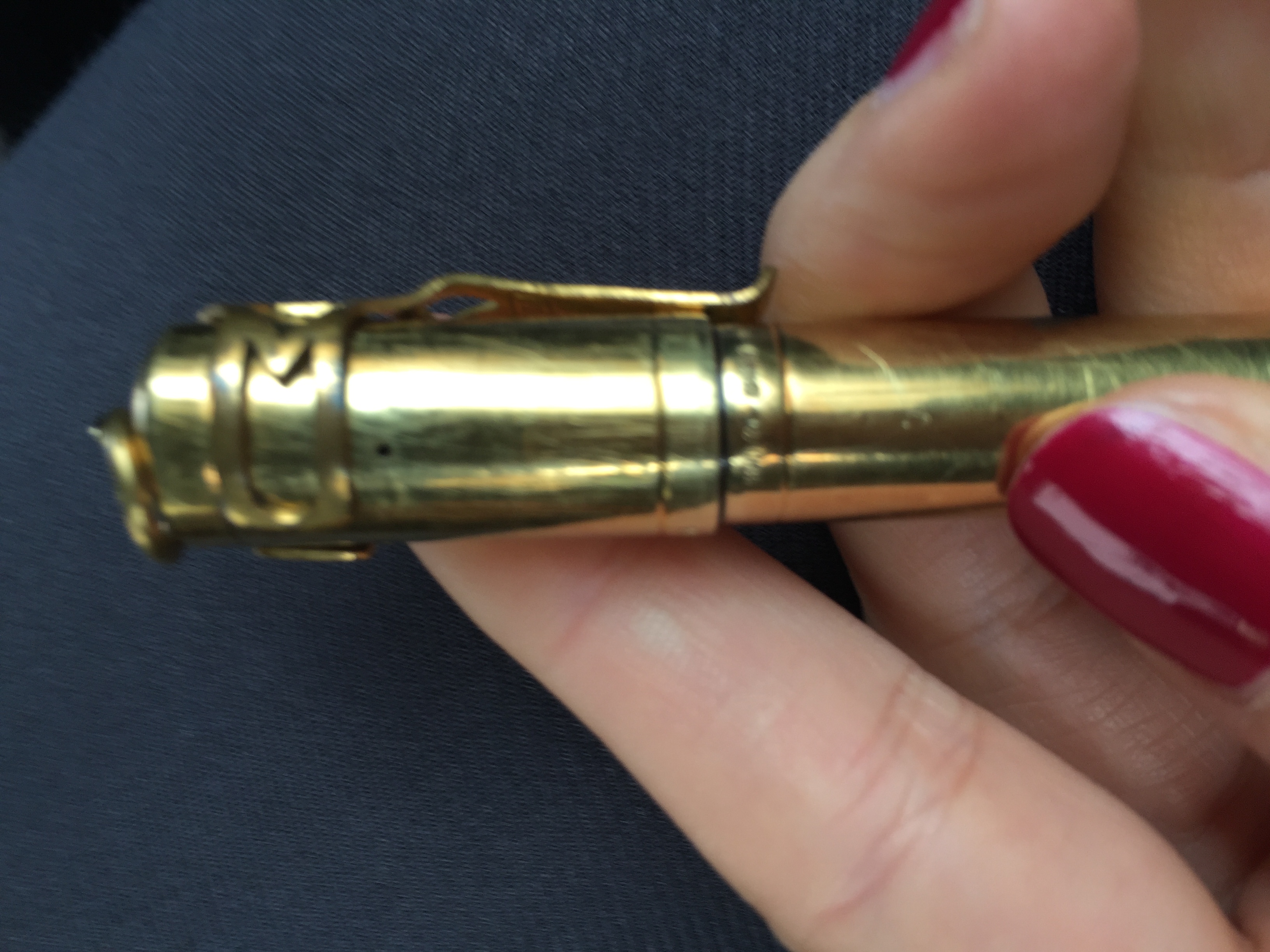 Il tappo è a vite ed è decorato da una specie di clip mobile nella quale vi è una lettera B. Su tappo e fusto della penna c'è scritto 18KR.