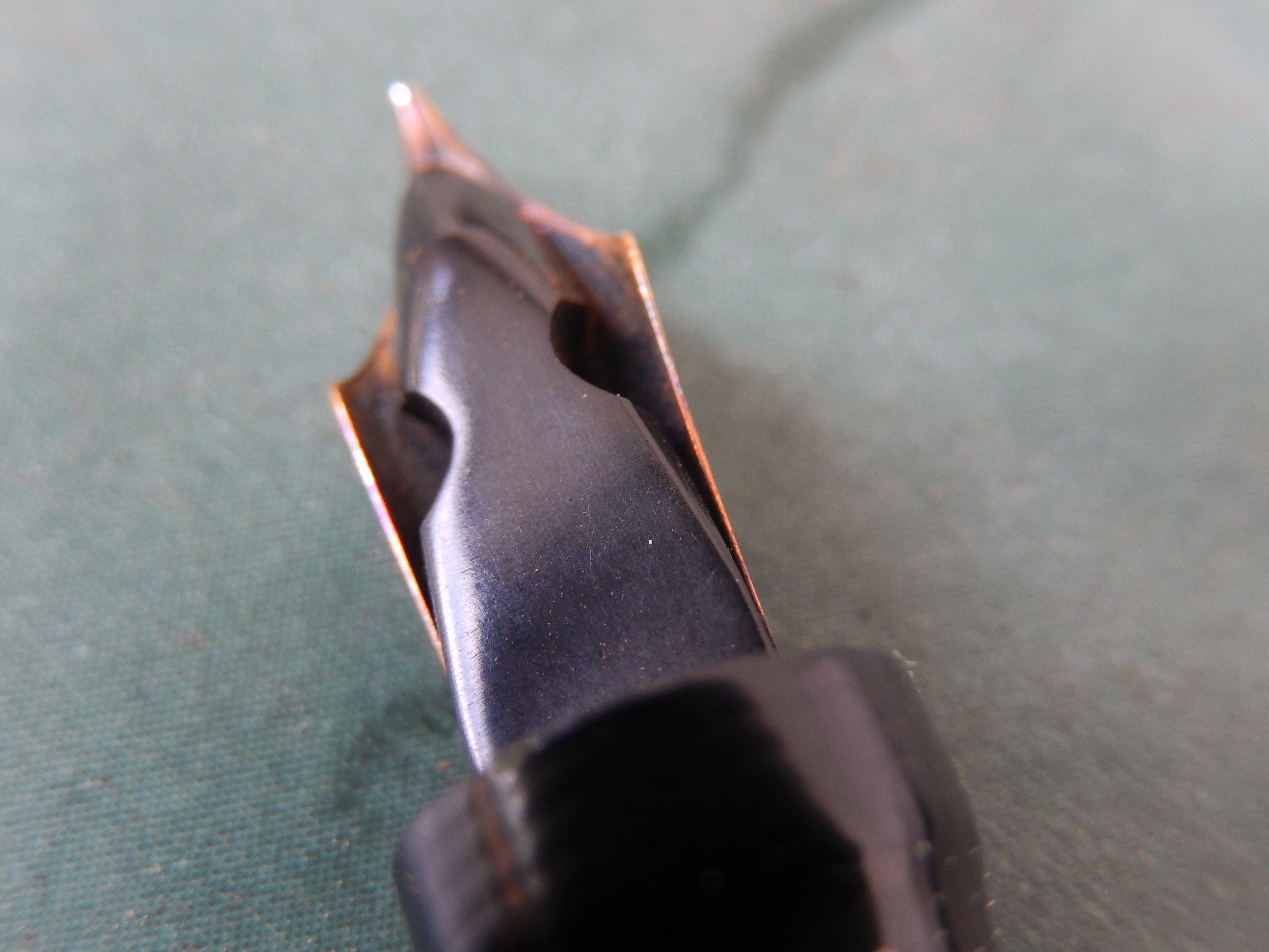Io suppongo sia una celluloide e, visto il prezzo economico (ma negli anni '30 poteva anche essere esorbitante) direi che il pennino è in acciaio placcato (ma potrei anche sbagliarmi di grosso visto che si vede chiaramente l'iridio) due materiali che sono molto soggetti all'azione del tempo in una penna. Se le mie supposizioni sono giuste il signor V. J. W. SCOTT si merita un plauso per come ha trattato questa bellezza!