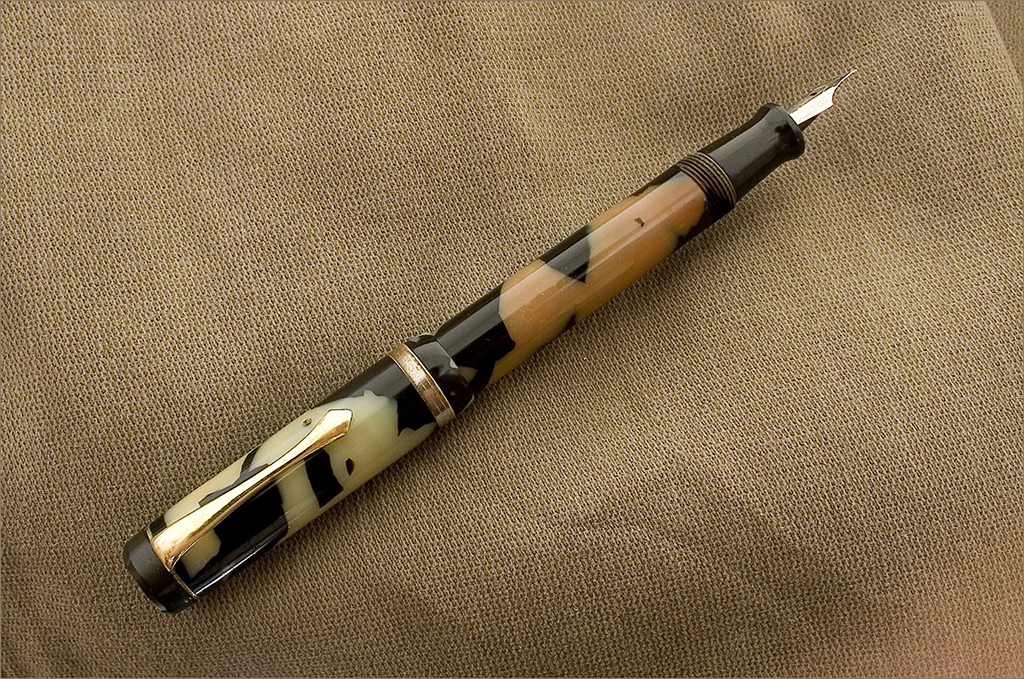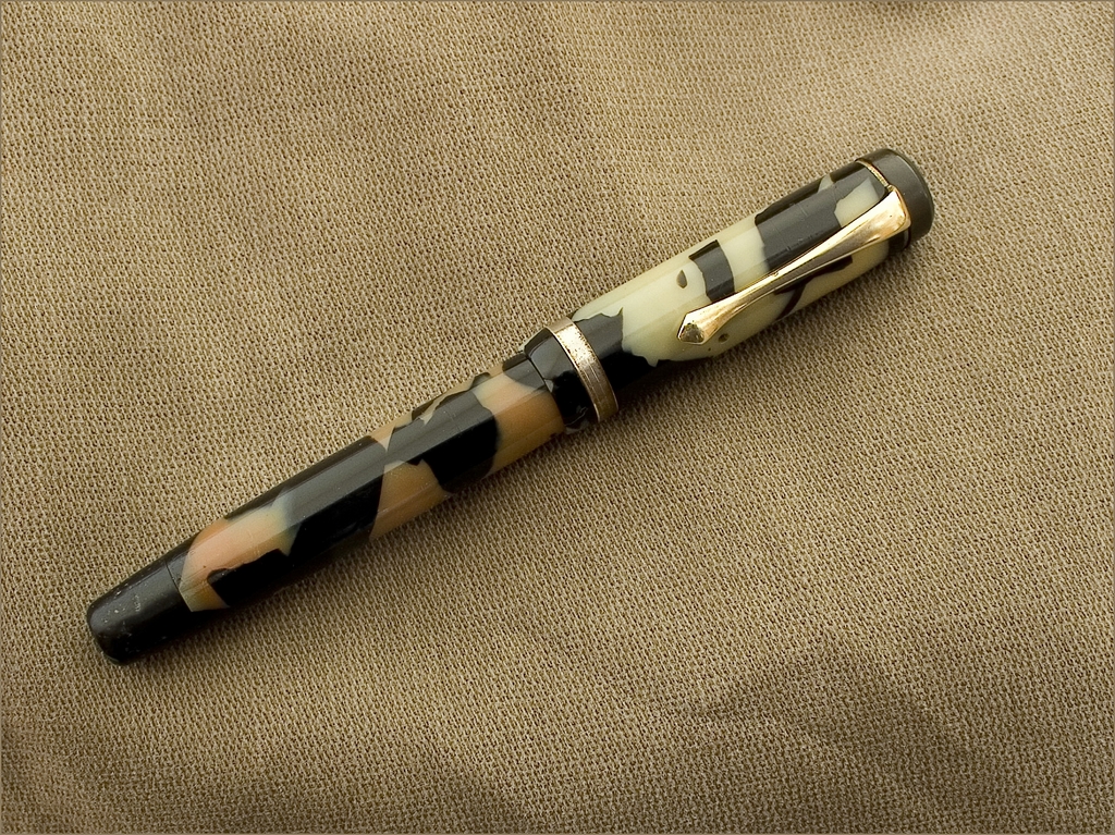 Purtroppo il colore della celluloide del fusto ha assunto una sfumatura rossastra , perdendo, come spesso accade, la gradevole colorazione originale che invece mantiene la celluloide del cappuccio.