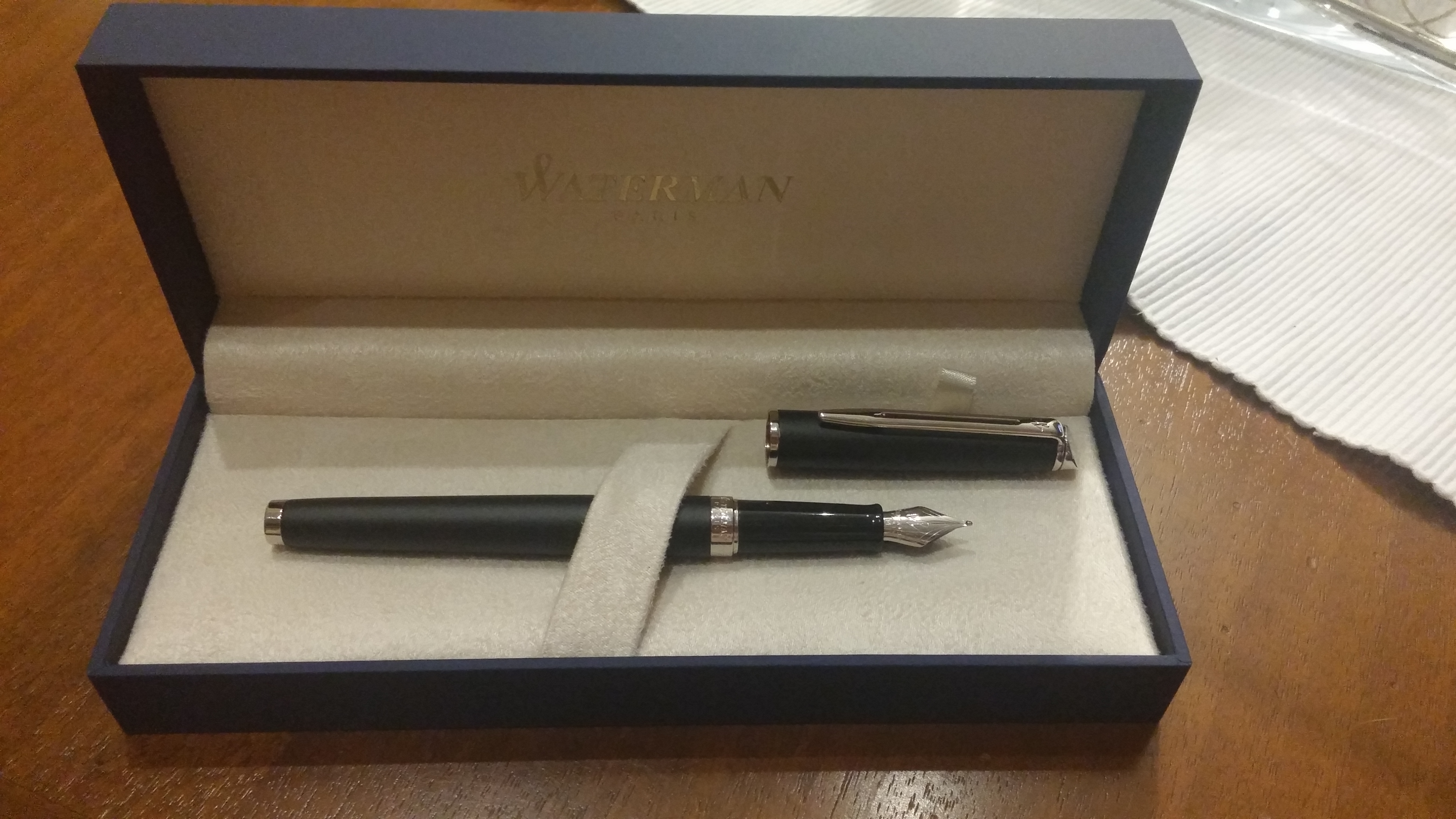 Mi sono letteralmente innamorata di una penna Aurora di cui non ricordo il nome, era nera opaca placcata in colore oro rosa, abbastanza grossa e bombata (passatemi il termine) che costava 99 euro. Alla fine però mi sono decisa su una penna Waterman hemisphere nera opaca cromata e più sottile rispetto alla precedente, da 92 euro. Ho fatto questa scelta sia perché il mio moroso non ha mani grandi, quindi magari per iniziare è più comoda una penna un po' più sottile, sia perché conoscendo i suoi gusti so che non avrebbe apprezzato troppo l'oro rosa.