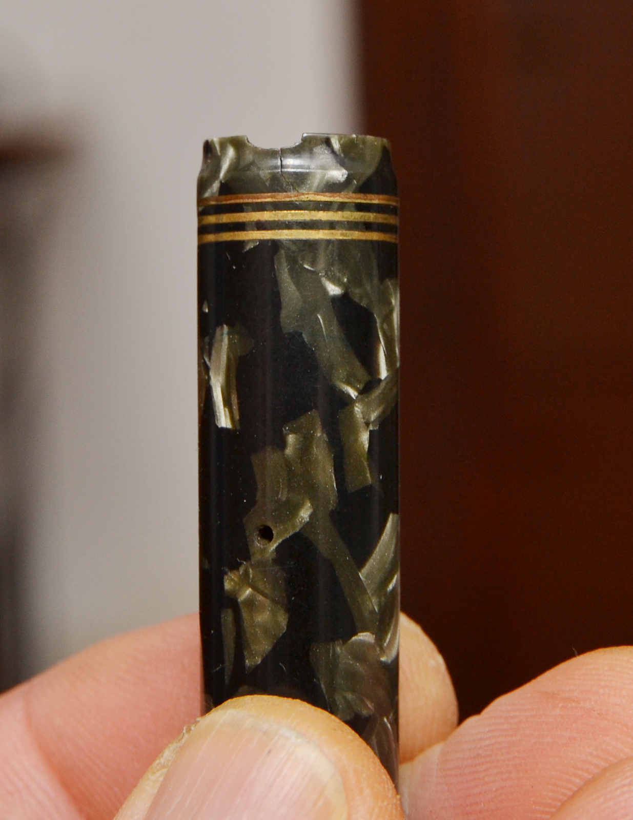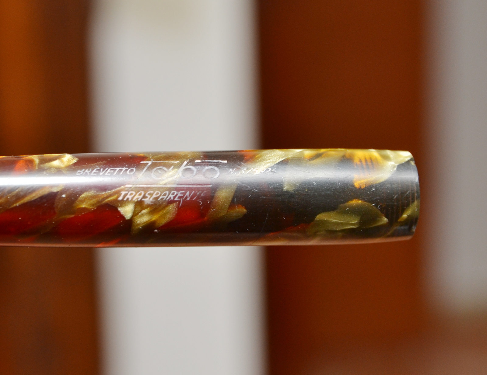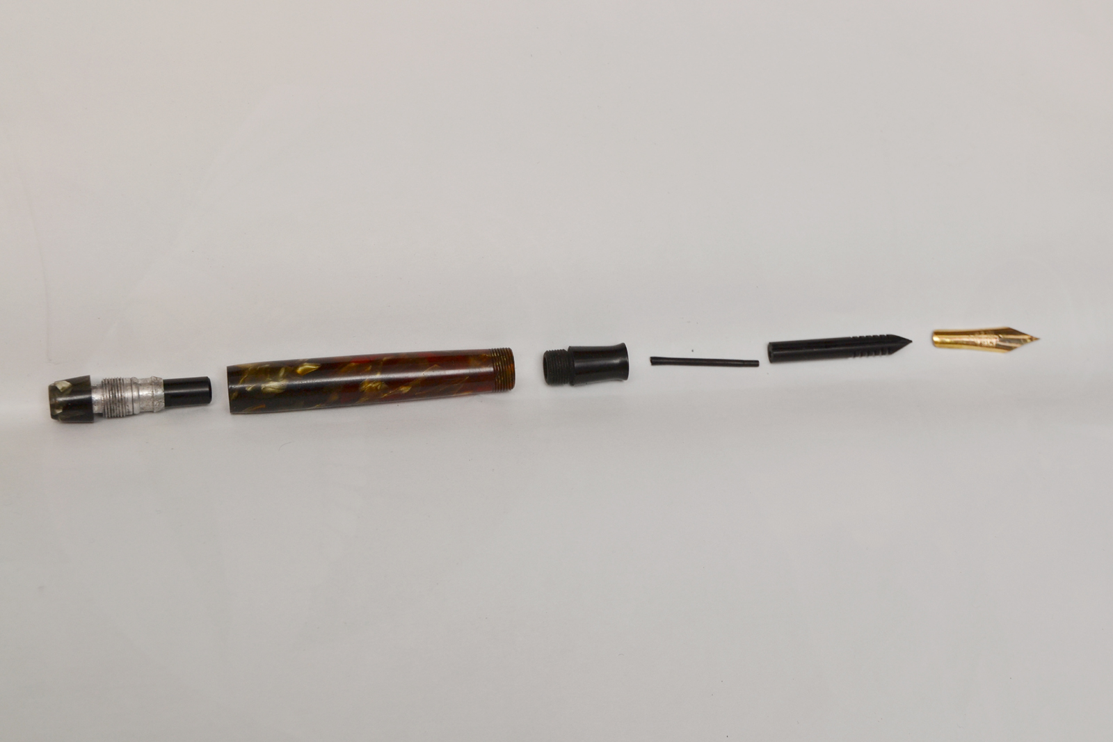 Il fondello è completamente solidale all'alberino di alluminio nel quale è avvitato (mi pare di ricordare tramite il gioiello). In posizione di riposo l'alberino è avvitato dentro lo stantuffo nero ed il fondello si trova perfettamente aderente al corpo: la parte superiore non filettata del cilindrotto d'allumino spunta dal corpo ed entra nel fondello che la va quindi a coprire. Svitando il fondello in realtà si svita l'alberino d'alluminio dall'interno dello stantuffo nero: il fondello si stacca dal corpo e consente di essere spinto in basso per effettuare l'azione di carica. Al termine del riempimento si avvita nuovamente il fondello. Il sistema è decisamente ben realizzato: seppur meno efficiente del Vacumatic, che sposta più aria facendo passare il diaframma di gomma dalla posizione concava a quella convessa, ha il vantaggio di essere decisamente robusto e di consentire la carica senza dovere rimuovere il fondello.