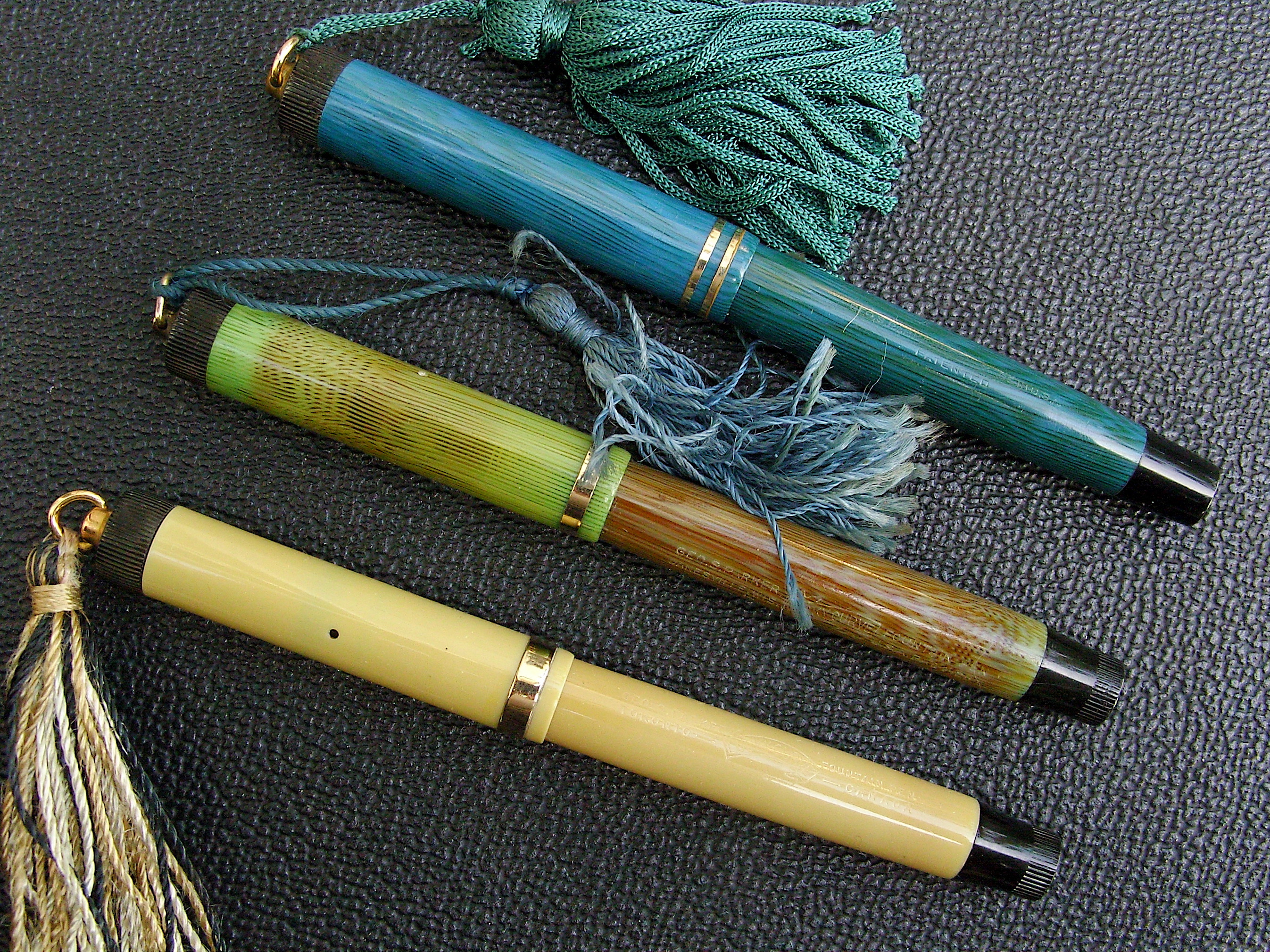 Contribuisco con le mie tre Pasrel: una Gray beige della prima serie "non moire" e con unico anello largo al cappuccio (1926), una Apple green, purtroppo piuttosto virata; questo colore che sostituì il proprio il Gray beige nel 1928. Infine una Naples blue nella versione streamlined introdotta nel 1929, che differisce per il fondello e la parte terminale del corpo più rastremati e per il puntale senza "scalino".