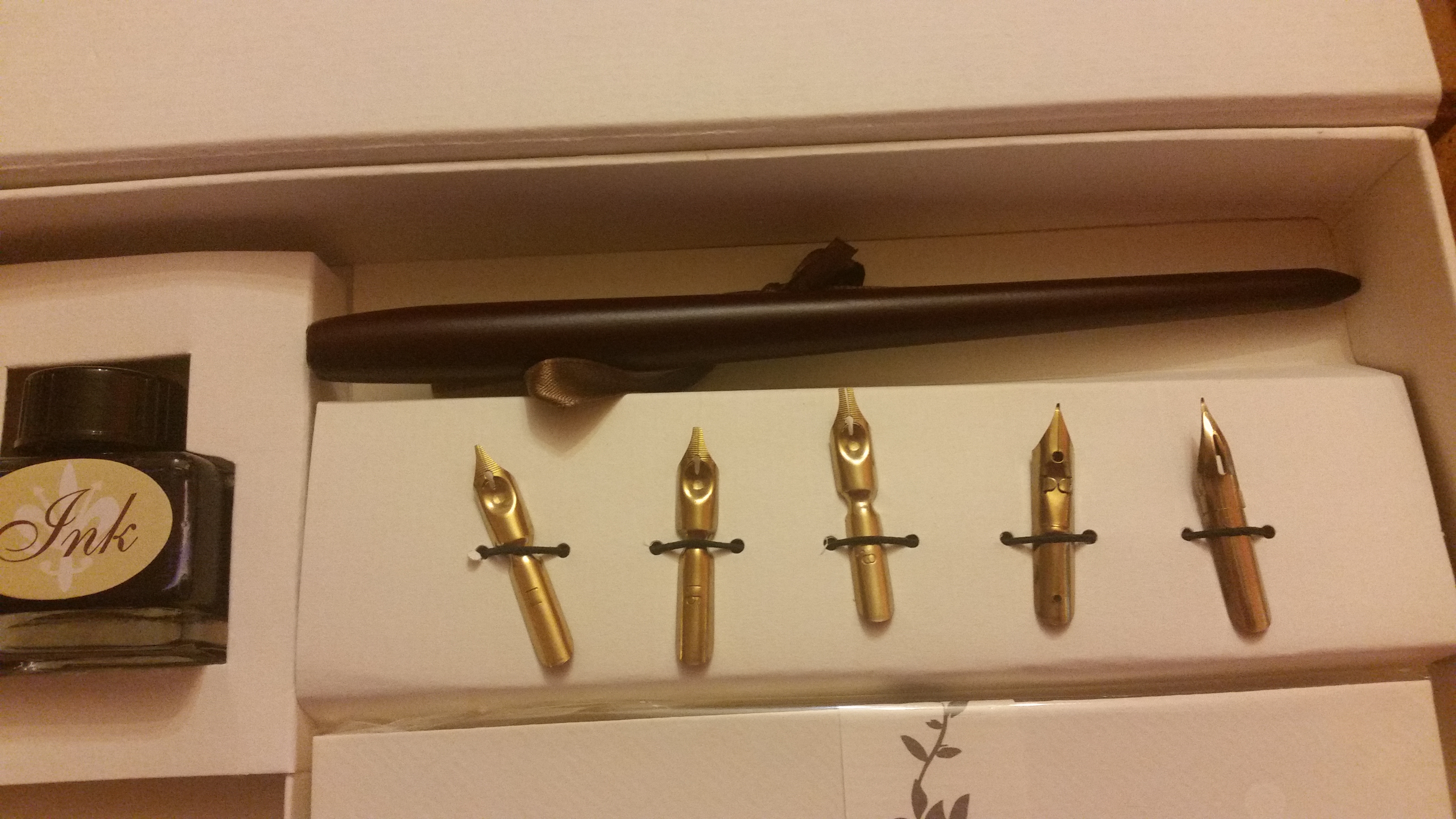 Le misure da sinistra dovrebbero essere 1.1, 1.5, 1.9. Il quarto da sinistra quindi il primo a punta dovrebbe avere in serbatoio sotto mentre l'ultimo da sinistra lo dovrebbe avere sopra. Insieme ci sono anche dei biglietti con le relative buste, 1 barretta di ceralacca con timbro (non sono sicura si chiami così) e una boccetta di inchiostro che è estremamente liquido.