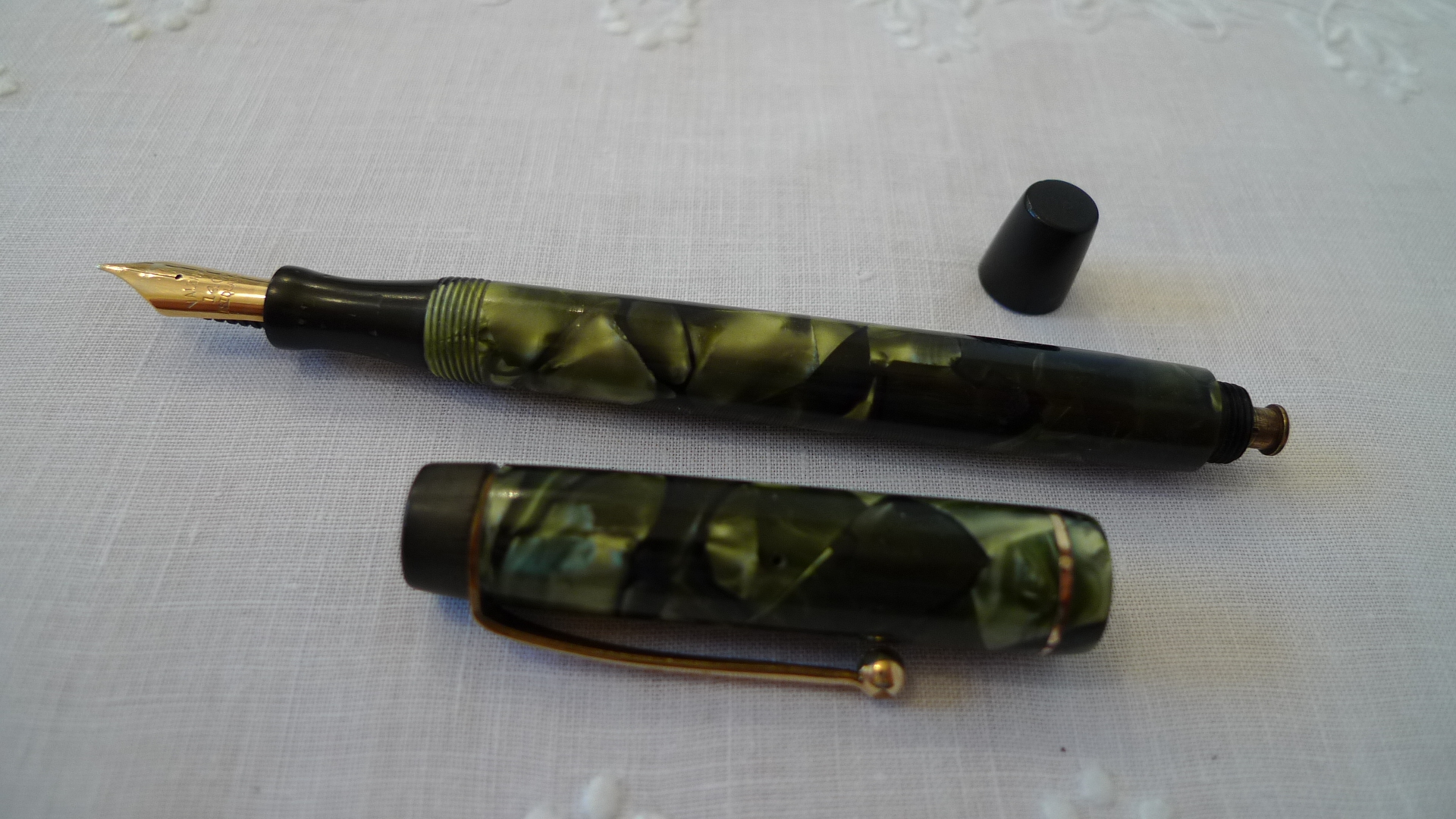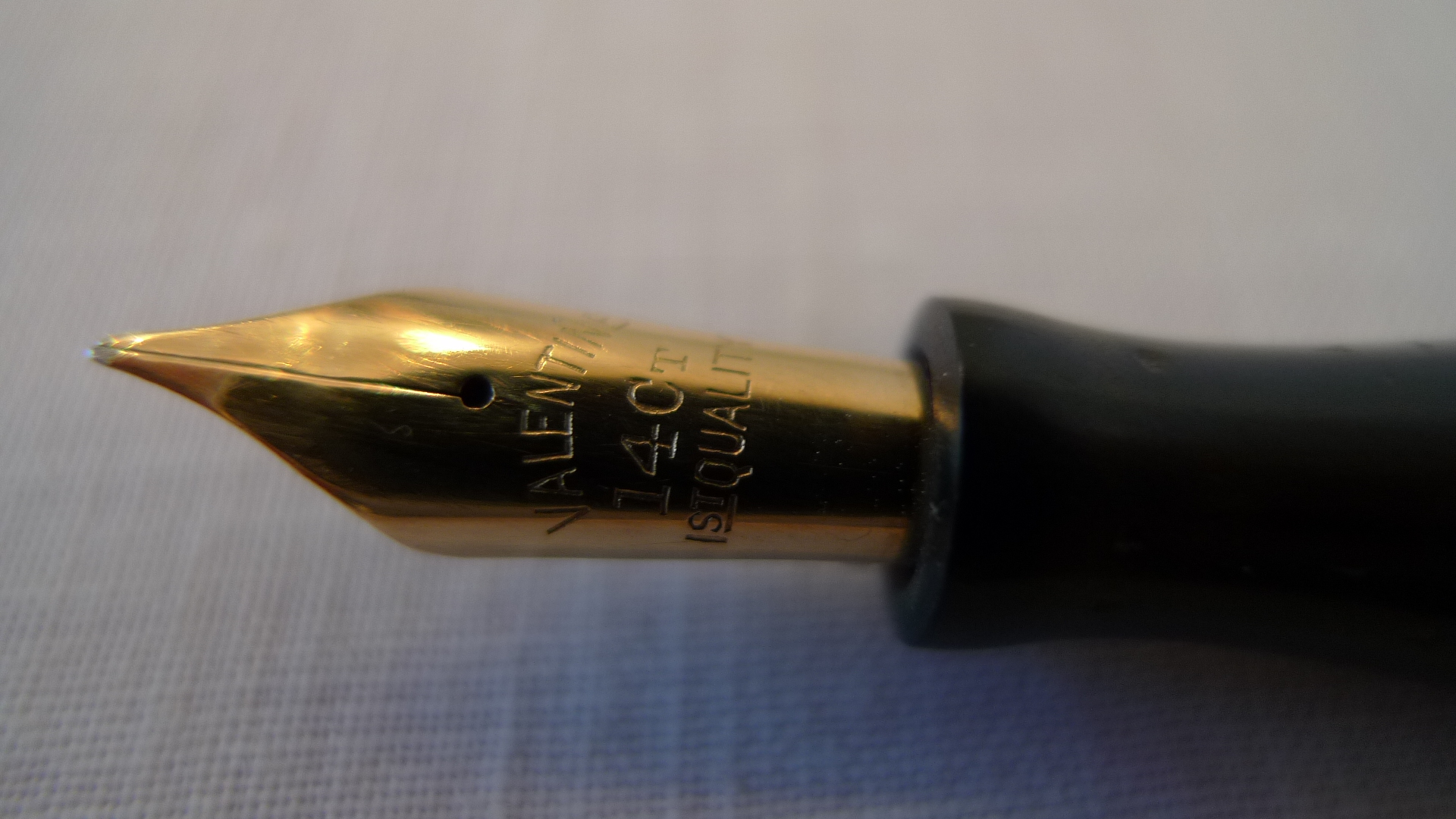 In linea teorica, potrebbe anche trattarsi dell'inverso: una Parker con pennino Valentine, ma tenderei ad escluderlo, data la forma della sezione (e qui passo la parola agli esperti). In ogni caso, se non vado errato, anche le Parker Duofold portavano la loro bella scritta sul fusto.
