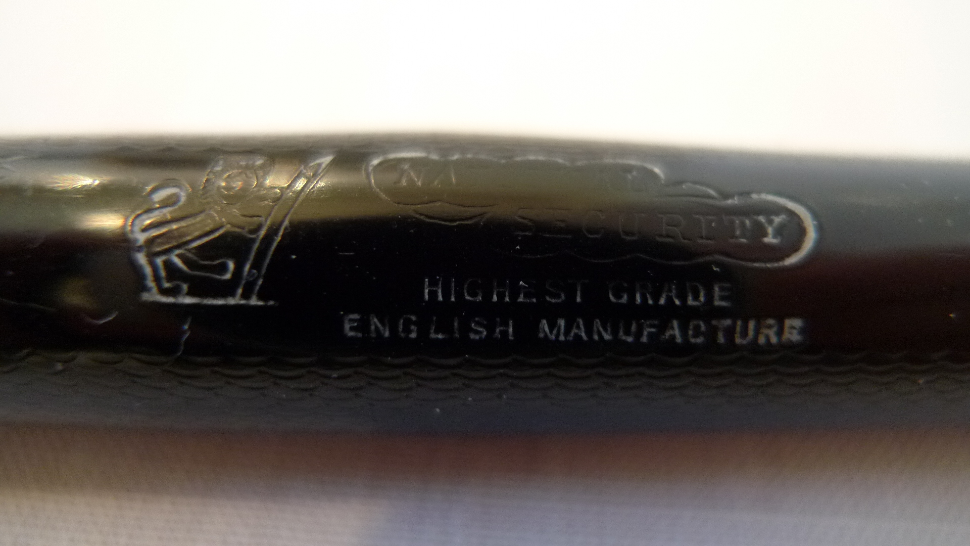 Ciao, posso dirti che National Security fu il marchio utilizzato per le stilografiche dalla British Carbon Papers dal 1920 al 1935 circa ; sul corpo dovrebbe ( le foto non mi consentono di verificare bene ) essere presente un marchio rappresentante un leone sorridente che impugna una stilografica. Penne molto affidabili. Ti allego la foto di una delle mie. Buon 2017