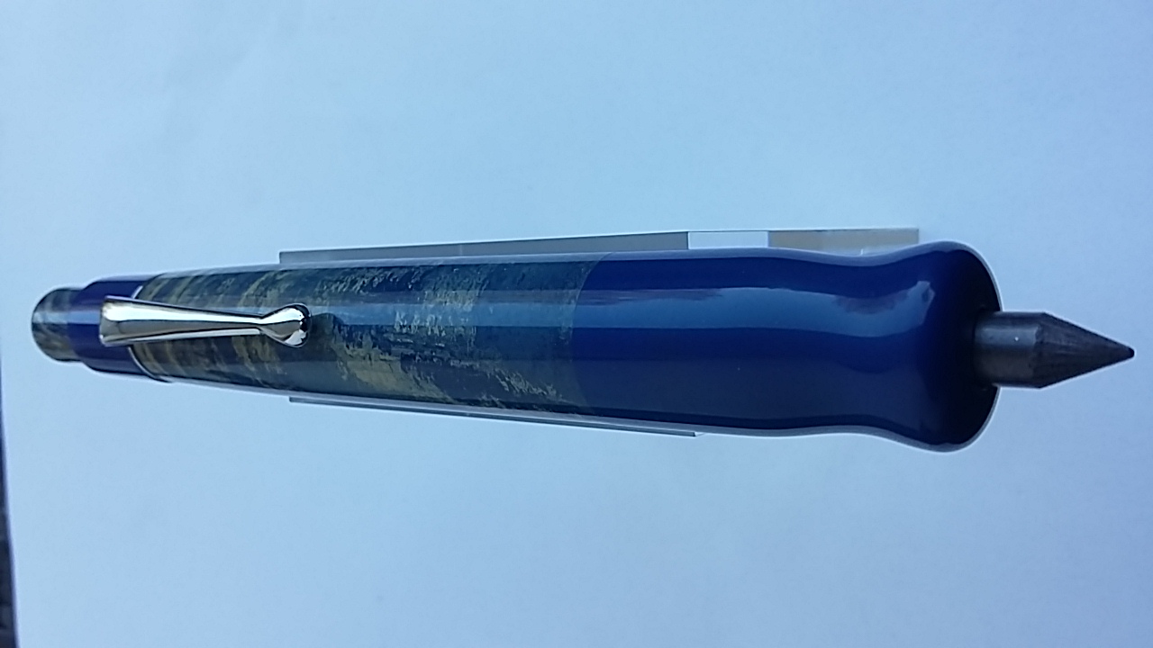 Il materiale utilizzato è l'ebanite e come si può vedere dalle foto la sezione è il fondello sono di colore blu, invece il corpo e il pulsante in blu e bianco.