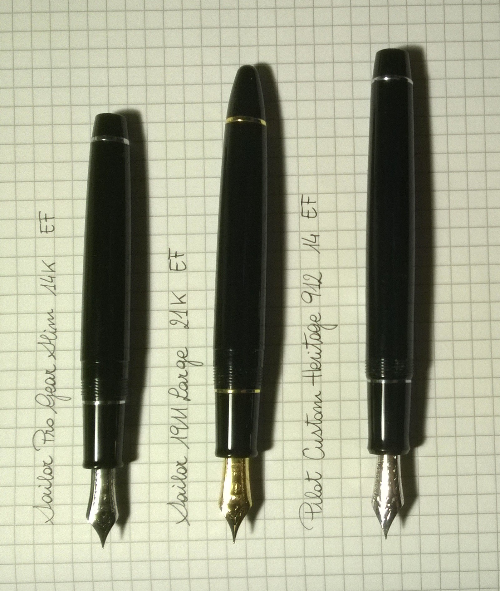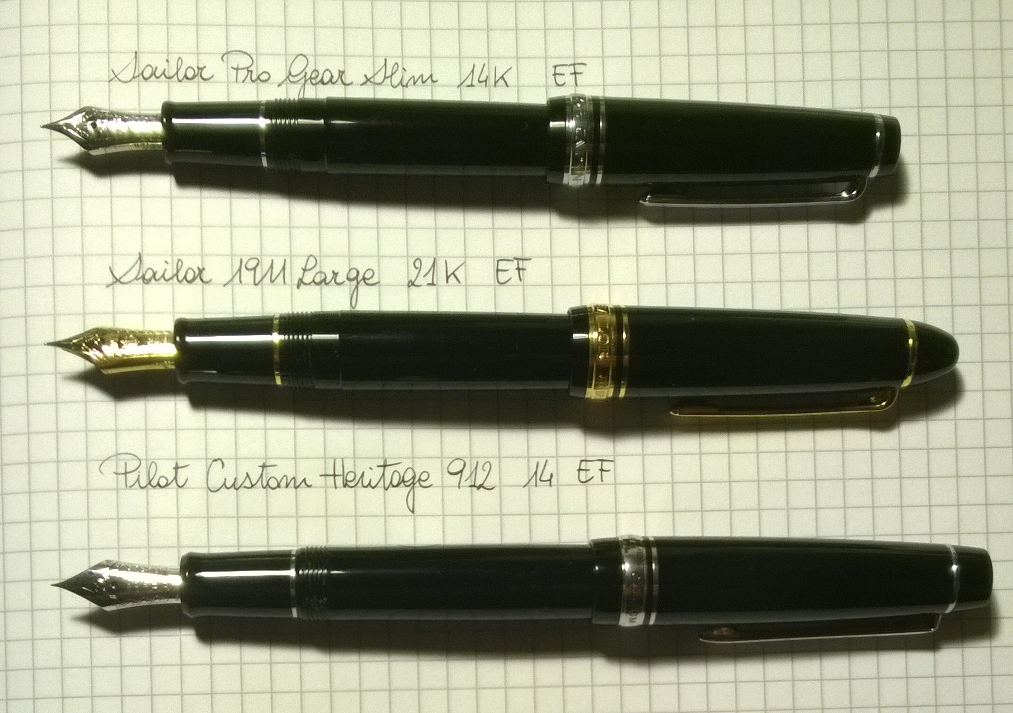 Ti lascio tre foto. La Sailor 1911 Large con il pennini 21K ha un flusso più abbondante. La cosa migliore che puoi fare è tenerle in mano e provarle.
