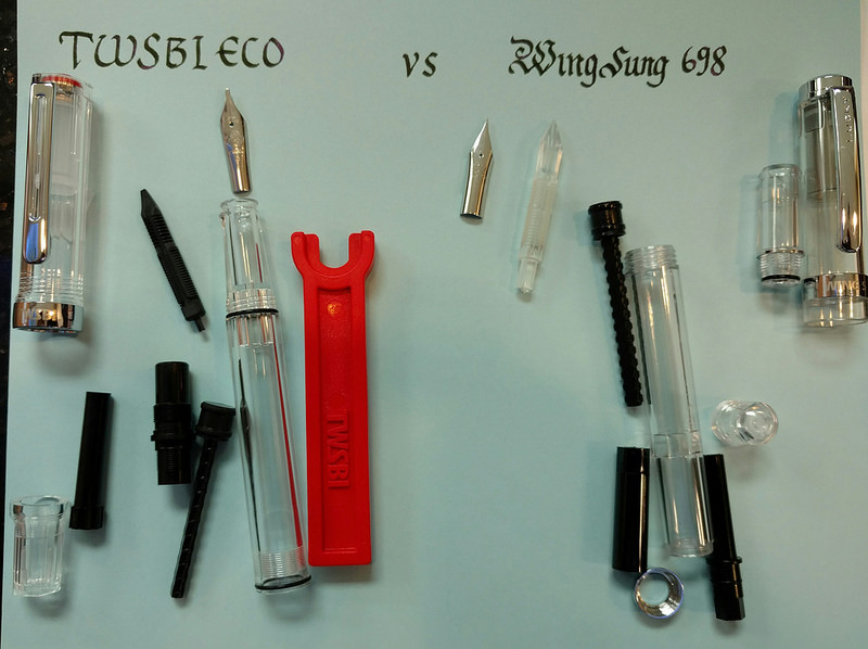 Per chi può interessare, la più economica stilografica a pistone attualmente in commercio (a parte la vecchia ma sempre validissima Reform 1745, sempre in qualche modo reperibile) è la indiana FPR Guru (in verione demo o colorata): $ 9,00, può montare un'ampia gamma di pennini, dall'EF al Broad allo Stub 1.1 ed al Flex. Sono completamente e facilmente smontabili, ne ho una che uso da anni (saltuariamente) con pennino Flex e non ho riscontrato problemi o difetti. Sensazione un po' "plasticosa", ovviamente, ma dato il prezzo...