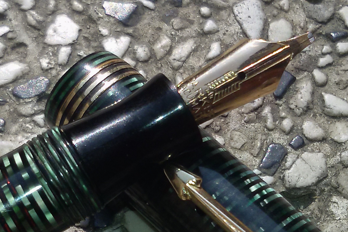 Complimenti per l'acquisto. Mi piacciono proprio le Vacumatic Green Pearl; all'atto di comprare il primo vintage ero indeciso tra la vacumatic e la 88, optando poi per quest'ultima. La cosa che attirò di più la mia attenzione é il fatto che quella celluloide e quel colore mi ricordano un grattacielo, anche se quando furono prodotte di grattacieli ce n'erano veramente pochi nel mondo.