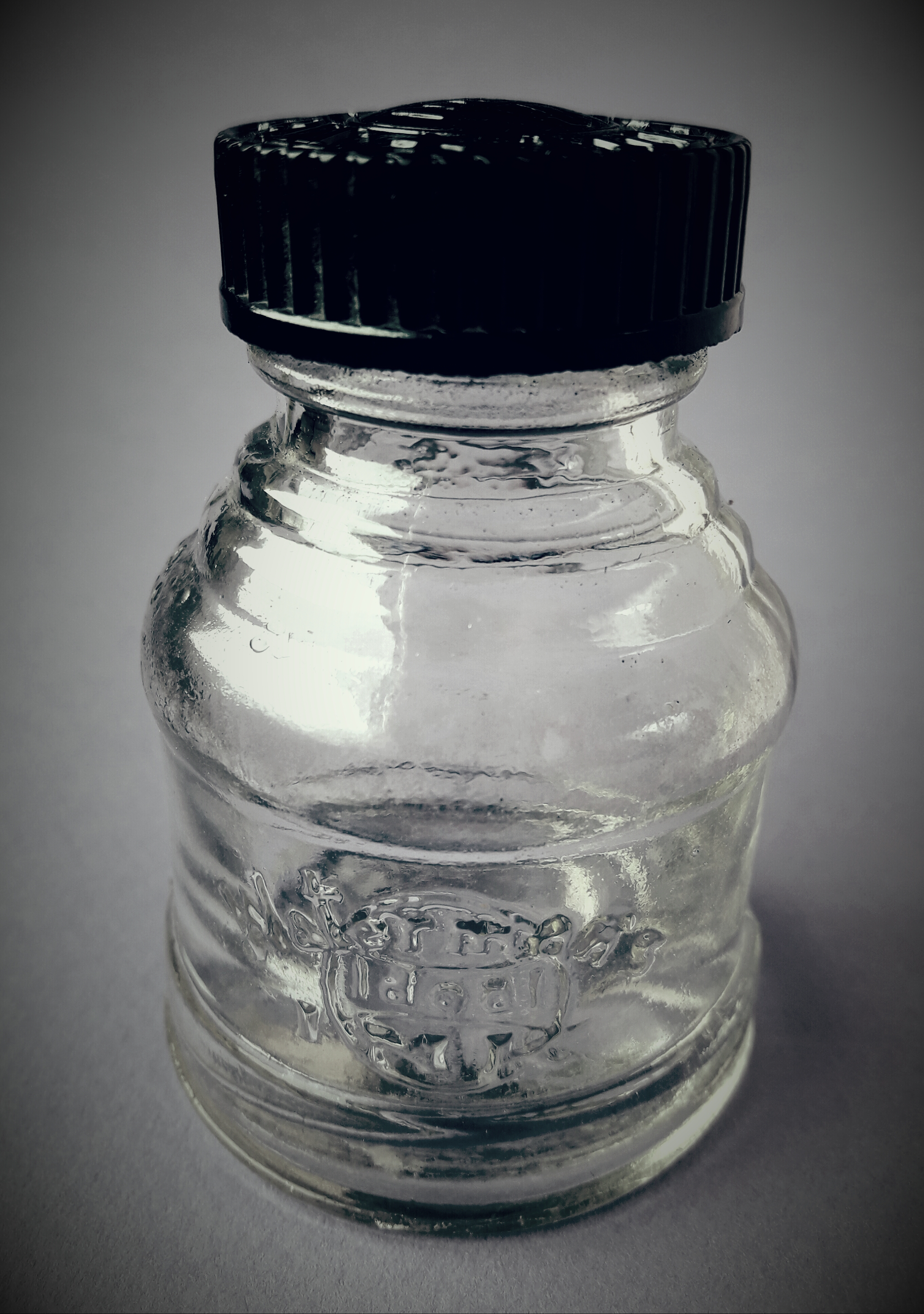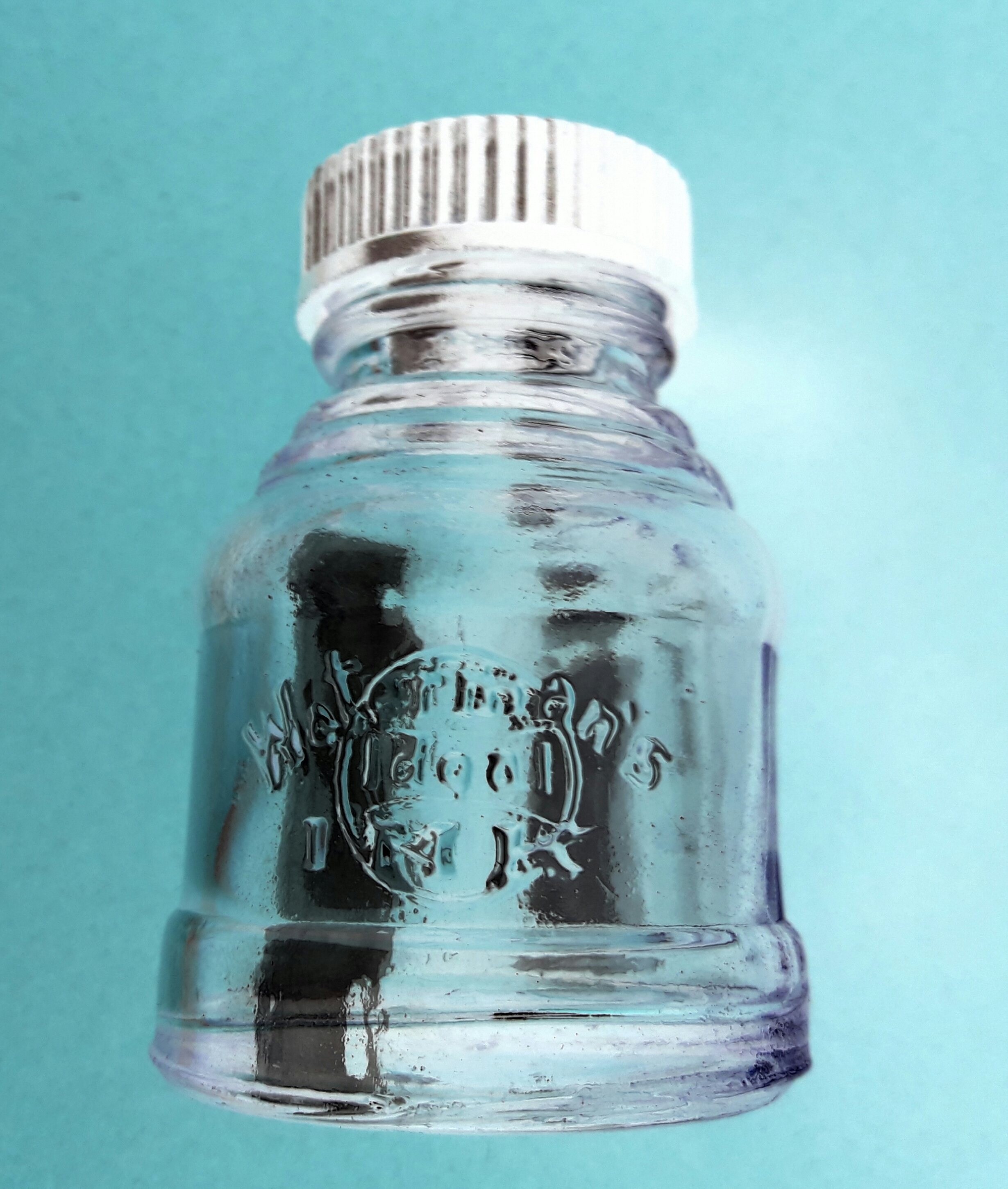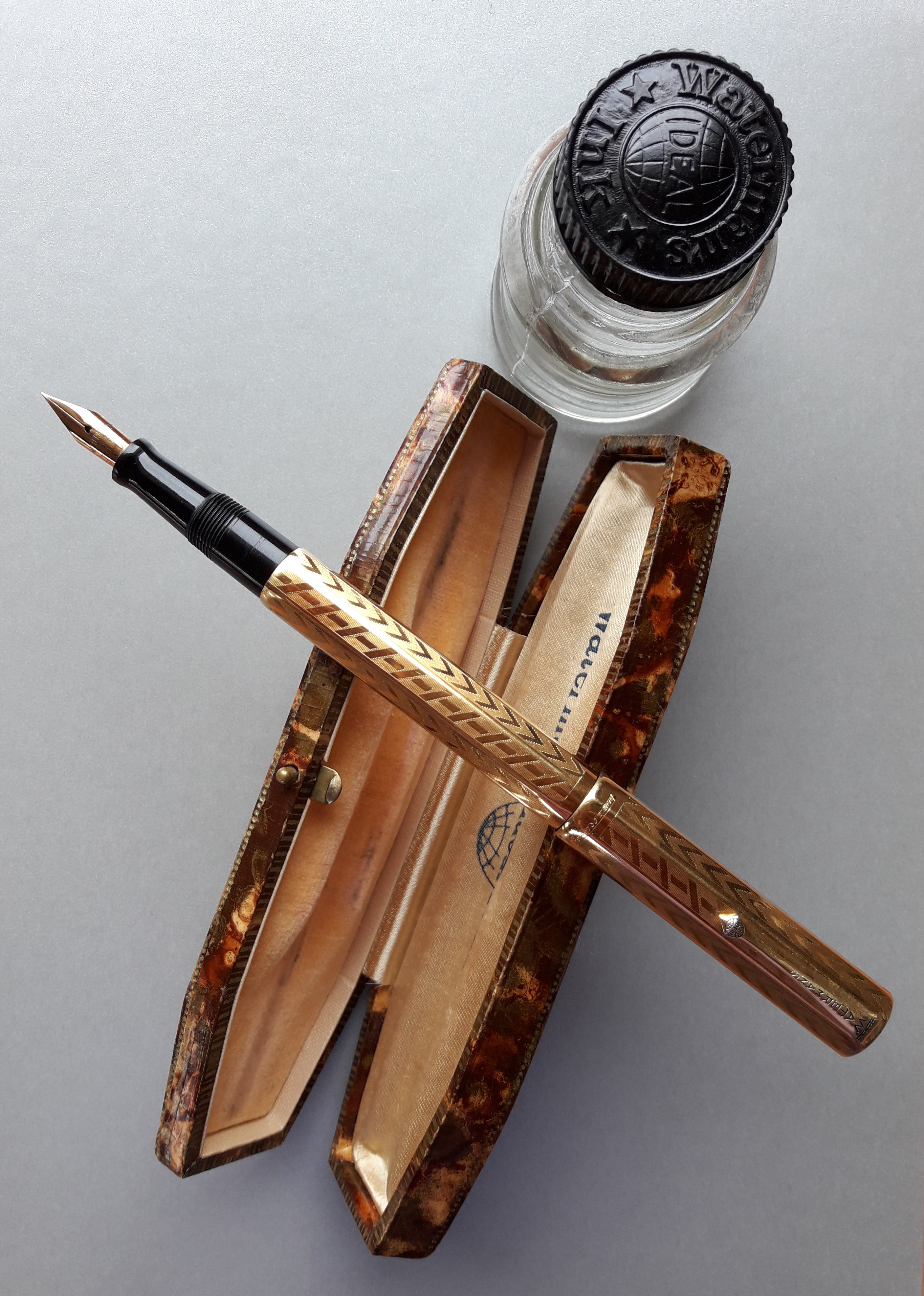 Potrebbe essere stata la boccetta standard per l’alimentazione di questa mia bella Waterman 52 rivestita Cavaliere con Marca di controllo di metà anni Trenta… Sotto la bottiglia è presente una ulteriore serie di scritte, verosimilmente apposte dal vetraio costruttore (sì, perché le boccette erano realizzate a mano!