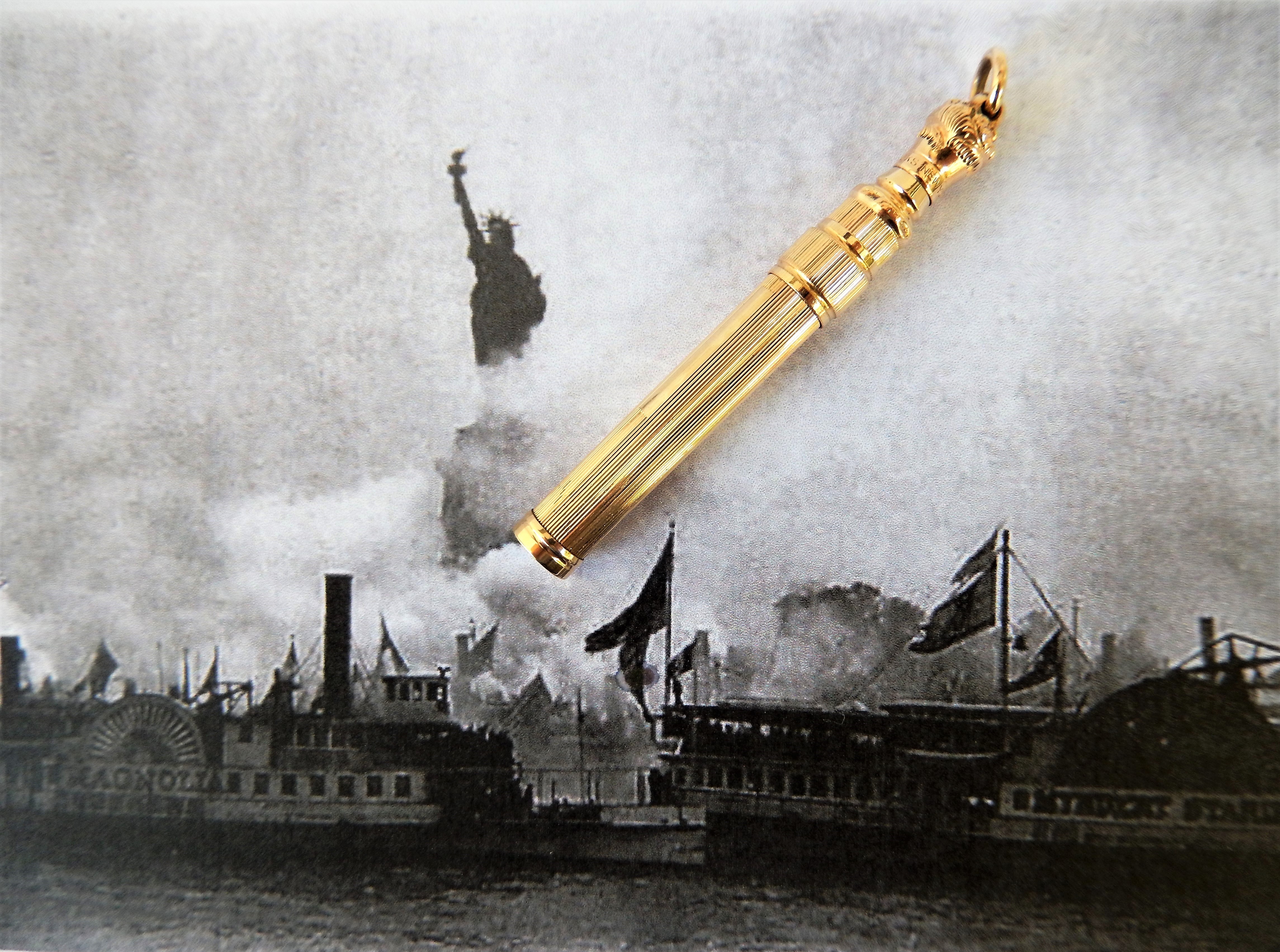 Erano quelli anni in cui New York cresceva esponenzialmente e si andava consolidando una ricca borghesia per la quale il possesso di un oggetto da scrittura in oro rappresentava un segno di distinzione ed affermazione ; si cominciavano a concepire costruzioni che sfidavano il cielo e veniva completata (1883) la costruzione del ponte di Brooklyn, che in questa vecchia stampa vediamo sorvolare velieri e navi a vapore.