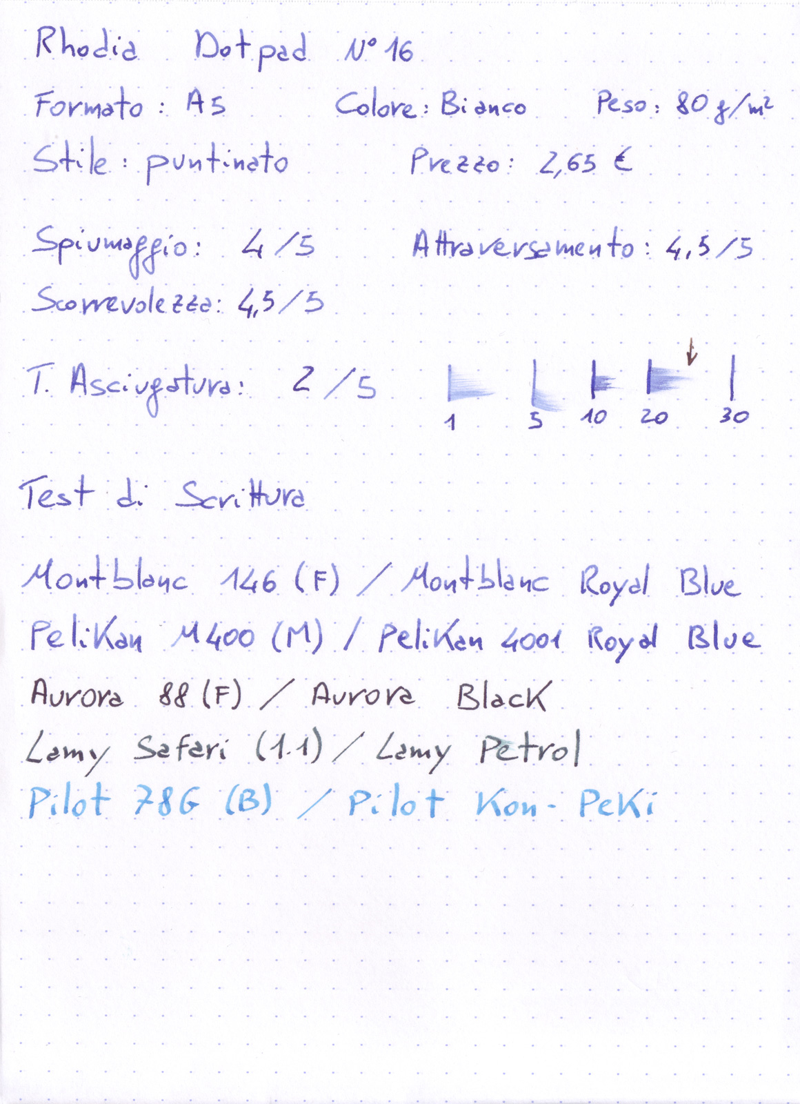 Infine è stato effettuato un test di scrittura, scrivendo poche parole in modo naturale, come si farebbe usualmente. Sono state utilizzate 5 diverse combinazioni penna/inchiostro piuttosto note ed aventi caratteristiche diverse :