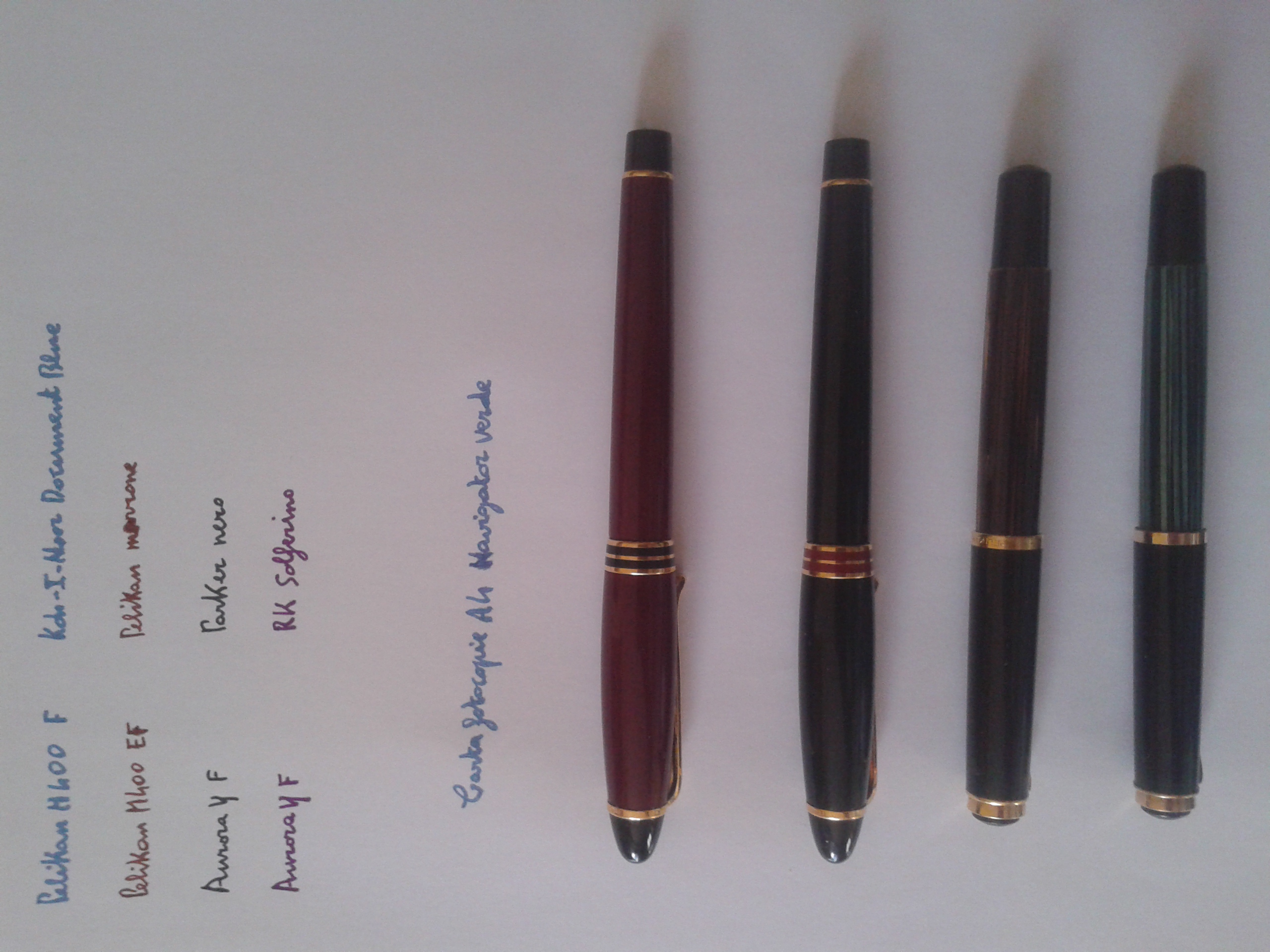 c’è un solo punto che stempera l’entusiasmo: il pennino “F”, mi avevano avvisato che era un F europeo, più largo, ma questo non è solo più largo non è nemmeno un M a me sembra un B, tutto questo non inficerà il piacere del possesso però mi scoccia, dimenticavo: l’inchiostro è il pelikan 4001 dark green di cui avevo letto la recensione e mi era piaciuto anzi mi piace ed il pennino F pelikan esalta lo shading (si dice così?) questo è vero ma il tratto è troppo largo,