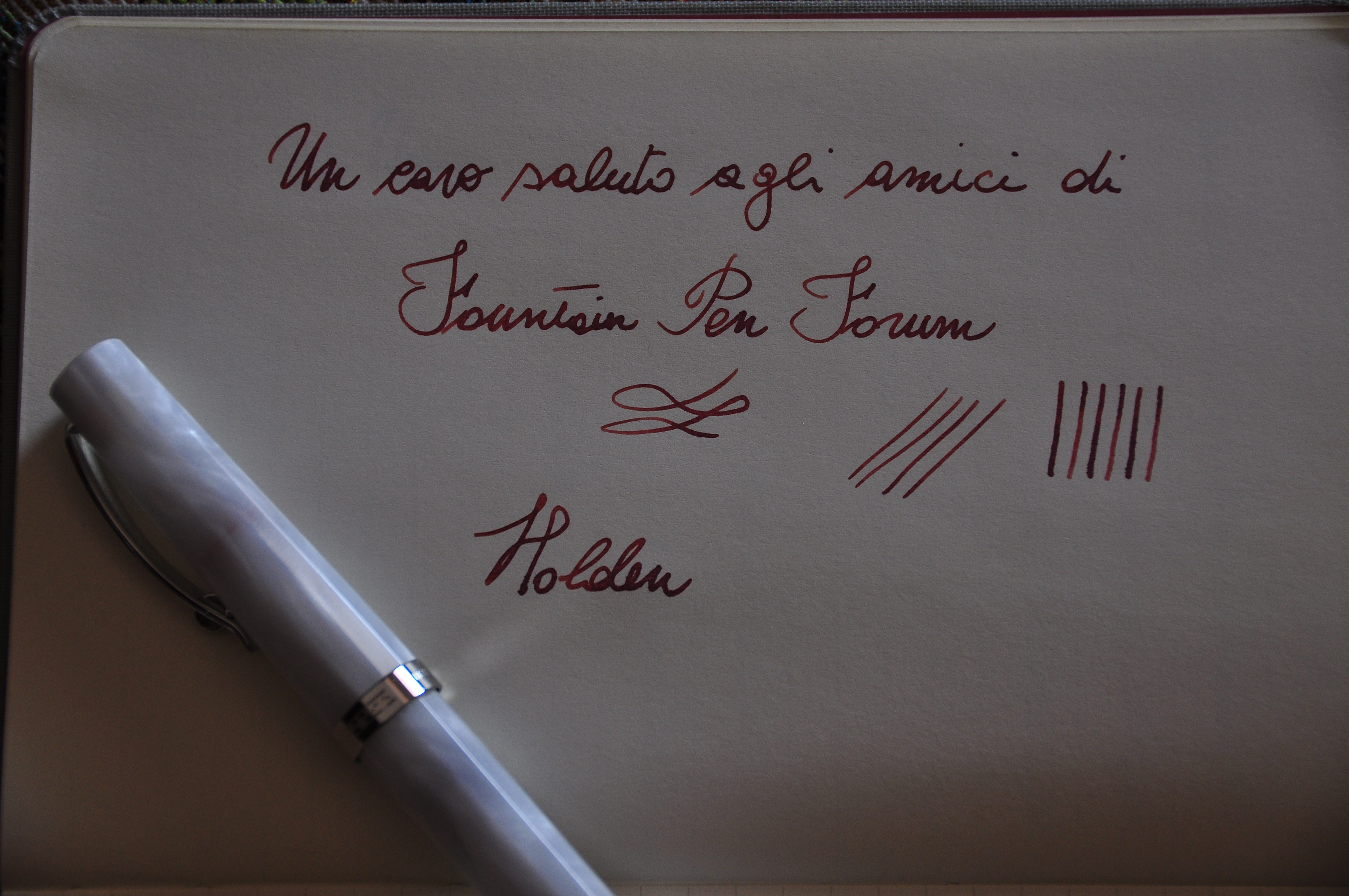 Ciao a tutti, in attesa della riapertura dei negozi (a proposito grazie per i consigli su dove cercare vintage) mi sono fatto tentare dal web e mi sono regalato questa penna. Dovrebbe essere una NOS, pennino gold 14k585 misura F, caricamento a converter. Dalle informazioni raccolte, che vi pregherei di correggere se il caso od integrare, dovrebbe risalire a metà degli anni '90, prodotta in resina di cotone con finiture dette high-tech. Le misure: circa cm.13,4 chiusa, 12,4 senza cappuccio. L'ho caricata con Mont Blanc Burgundy red, ed ho ottime impressioni. A voi le foto.