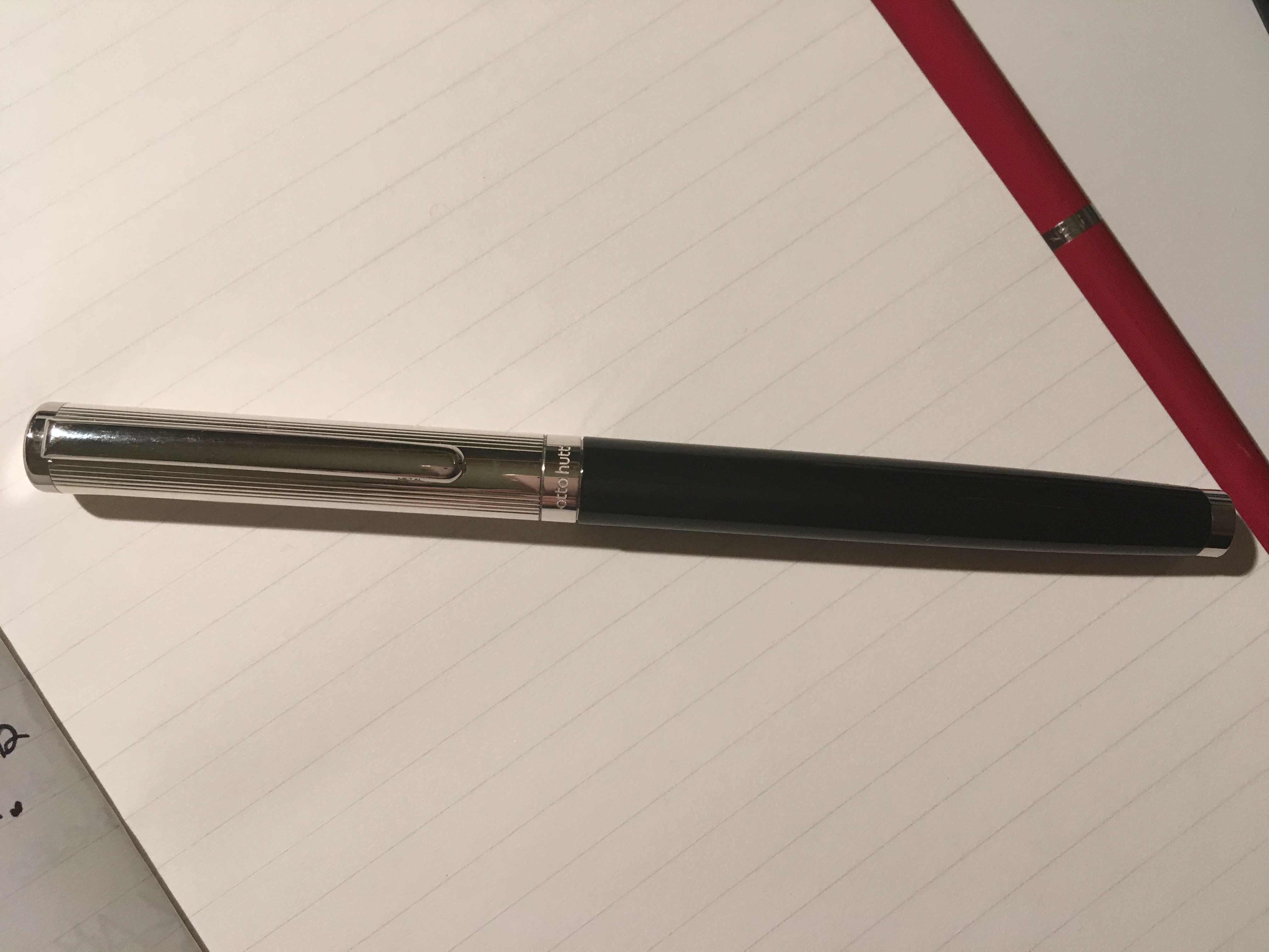 La penna, acquistata nuova per un centinaio di euro, presenta un cofanetto con chiusura a magnete molto elegante, con all'interno separati penna e converter standard, marchiato Otto Hut. Al tatto è molto piacevole, corpo fine nero lucido e cappuccio in argento sterling 925 con scanalature. La clip è resistente e il filo preciso nel fine corsa.