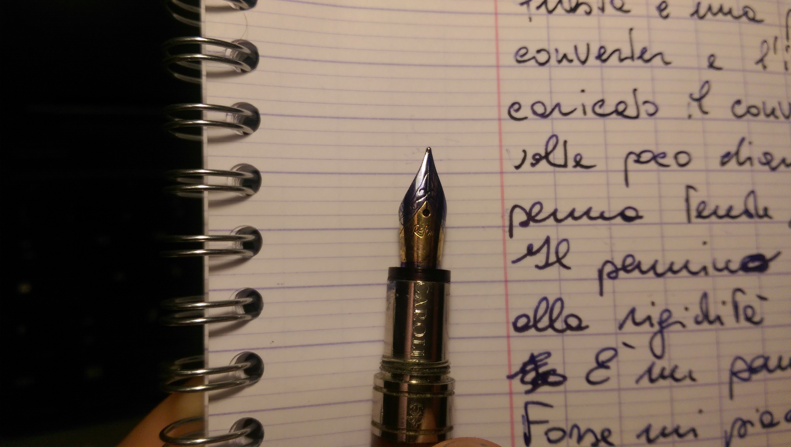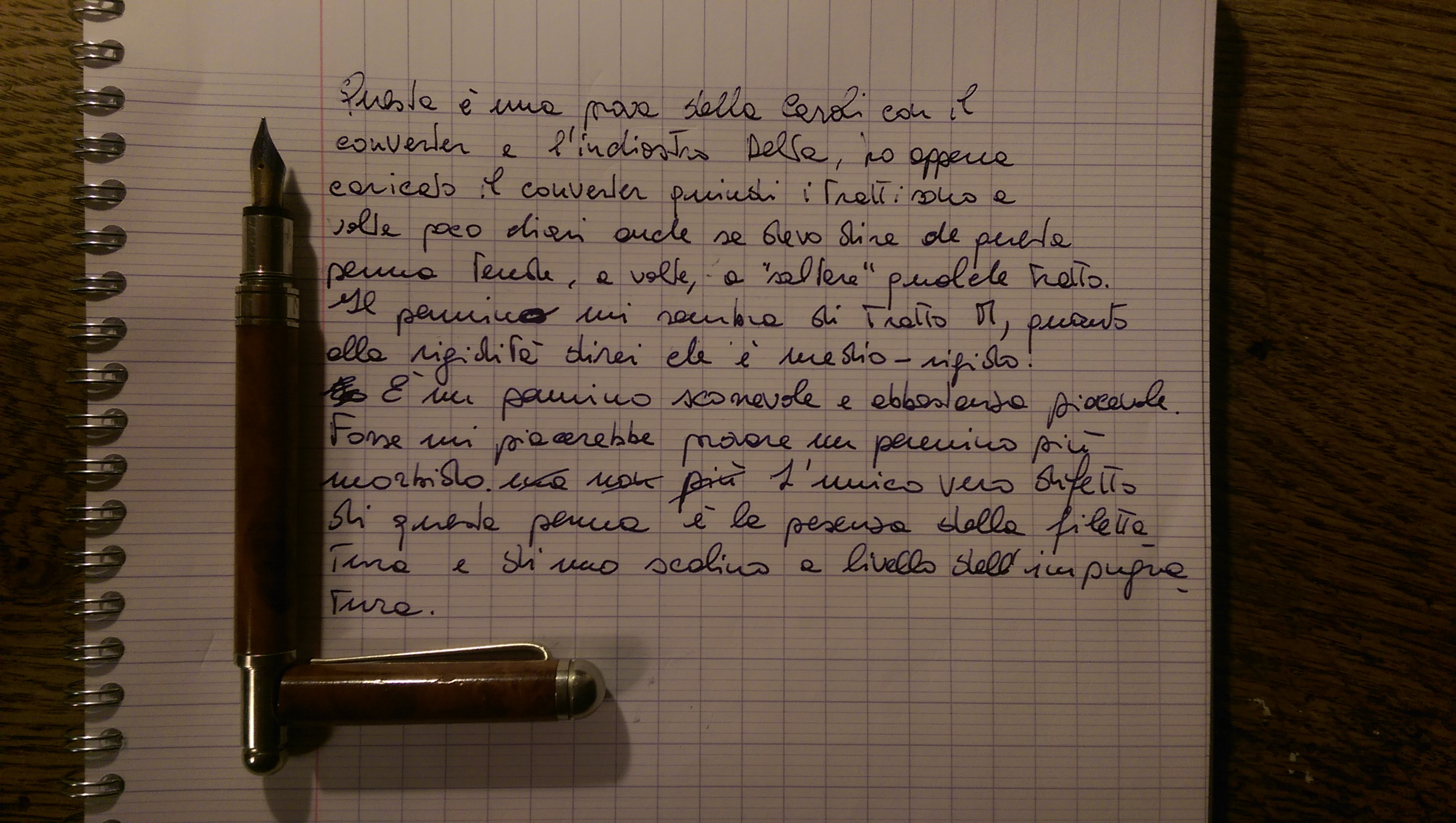 Pubblico una foto della penna che ho attualmente, si tratta di una Caroli che comprai negli anni 90 alla Casa della stilografica, credo che non esista più questa marca. Sul pennino c'è scritto Reform... a me piace come scrive, dev'essere un M, direi che non è troppo flessibile, è scorrevole però a volte alcuni tratti saltano. Non so di che materiali sia il pennino. L'unico vero difetto è nell'impugnatura, la filettatura dopo un pò fa male alle dita.