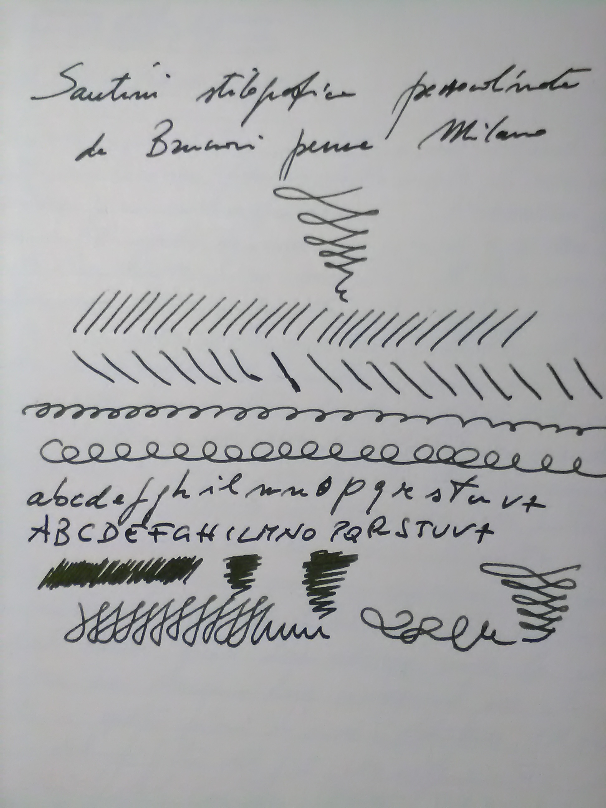 Tutto è cominciato con una foto su Instagram... Ho visto la foto di una penna coloratissima: ho approfondito la ricerca ed era un modello New Delhi della serie "Colori" dell'azienda Santini (cfr. http://www.santini-italia.com/serie-col ... delhi.html). Sono andato sul sito ed ho scoperto che questa azienda artigianale italiana produce penne dal 1998, con alcune serie ordinarie e alcune limitate. La serie "COlori" è il modello base con diverse varianti nel disegno e con le comuni caratteristiche nella forma e nel pennino: un grande pennino in oro 18 kt di produzione propria. DI questa azienda non ne avevo mai sentito parlare. Sul sito ho visto che i rivenditori sono quattro in tutto il mondo. Uno di questi è Brunori a Milano. Su Instagram ho chiesto informazioni alla ditta circa il prezzo e la disponibilità presso tale negozio del modello visto in fotografia. Dopo aver ricevuto una risposta affermativa mi sono recato alla prima occasione (il 22 dicembre) in questo bellissimo, raccolto e accogliente negozio e il titolare mi ha mostrato le due Santini che aveva: la New Delhi e la Circus (non vista sul sito). Senza esitare ho acquistato la Circus e oggi, giorno di Natale, ho potuto toglierla dalla sua scatola, inchiostrarla e provarla. Ecco le prime impressioni di scrittura: