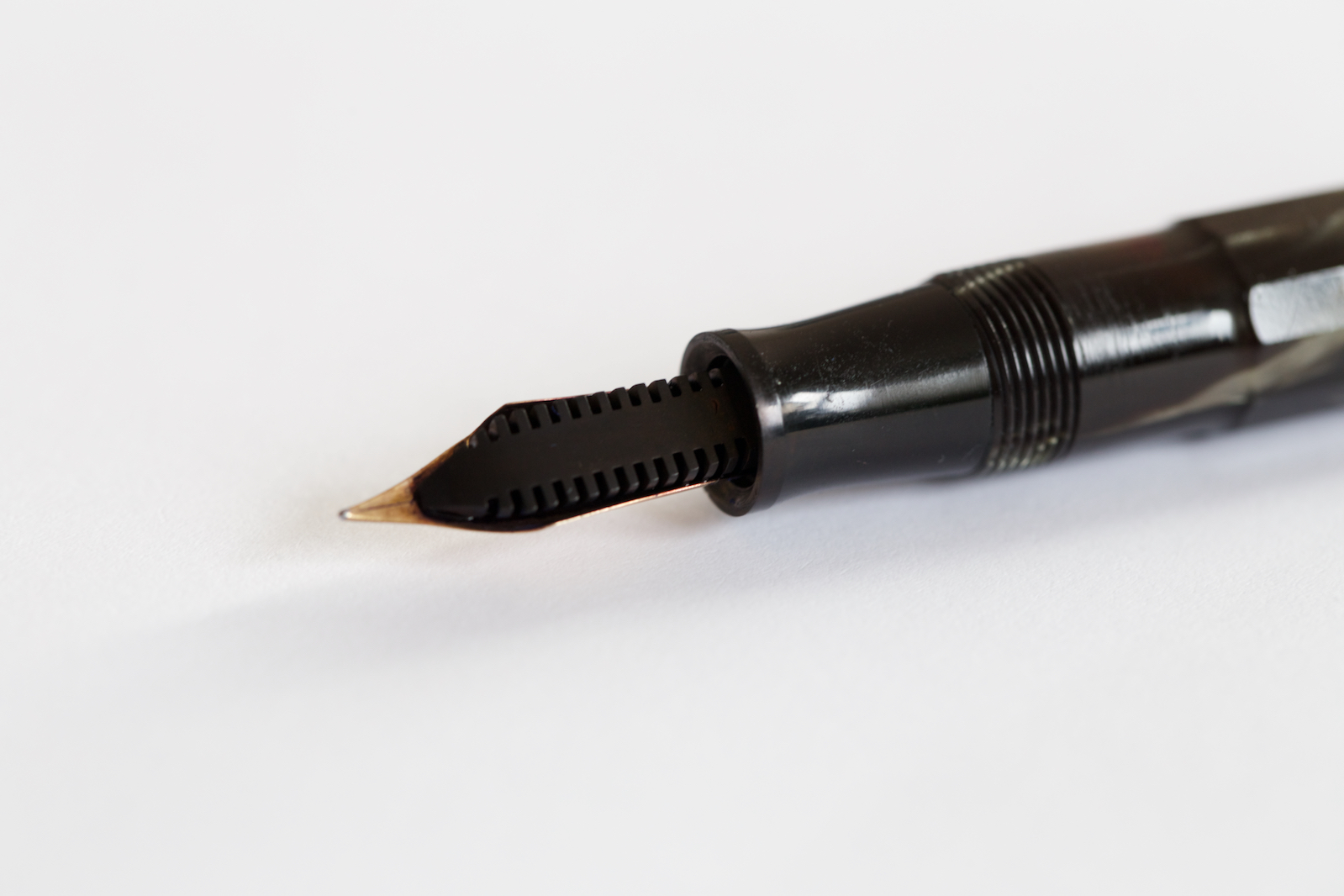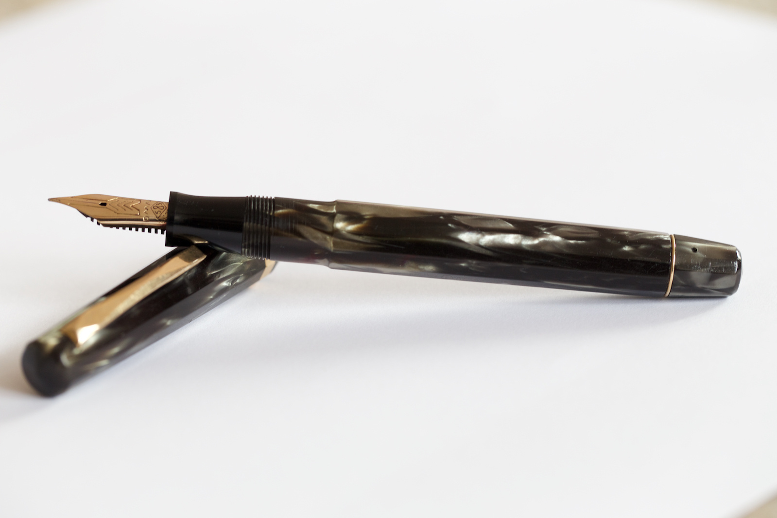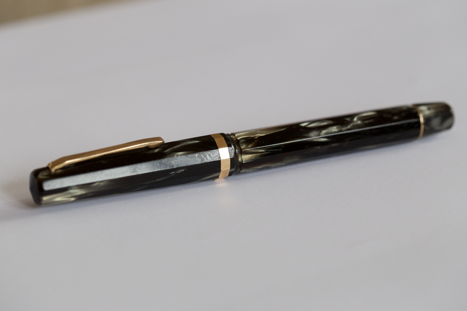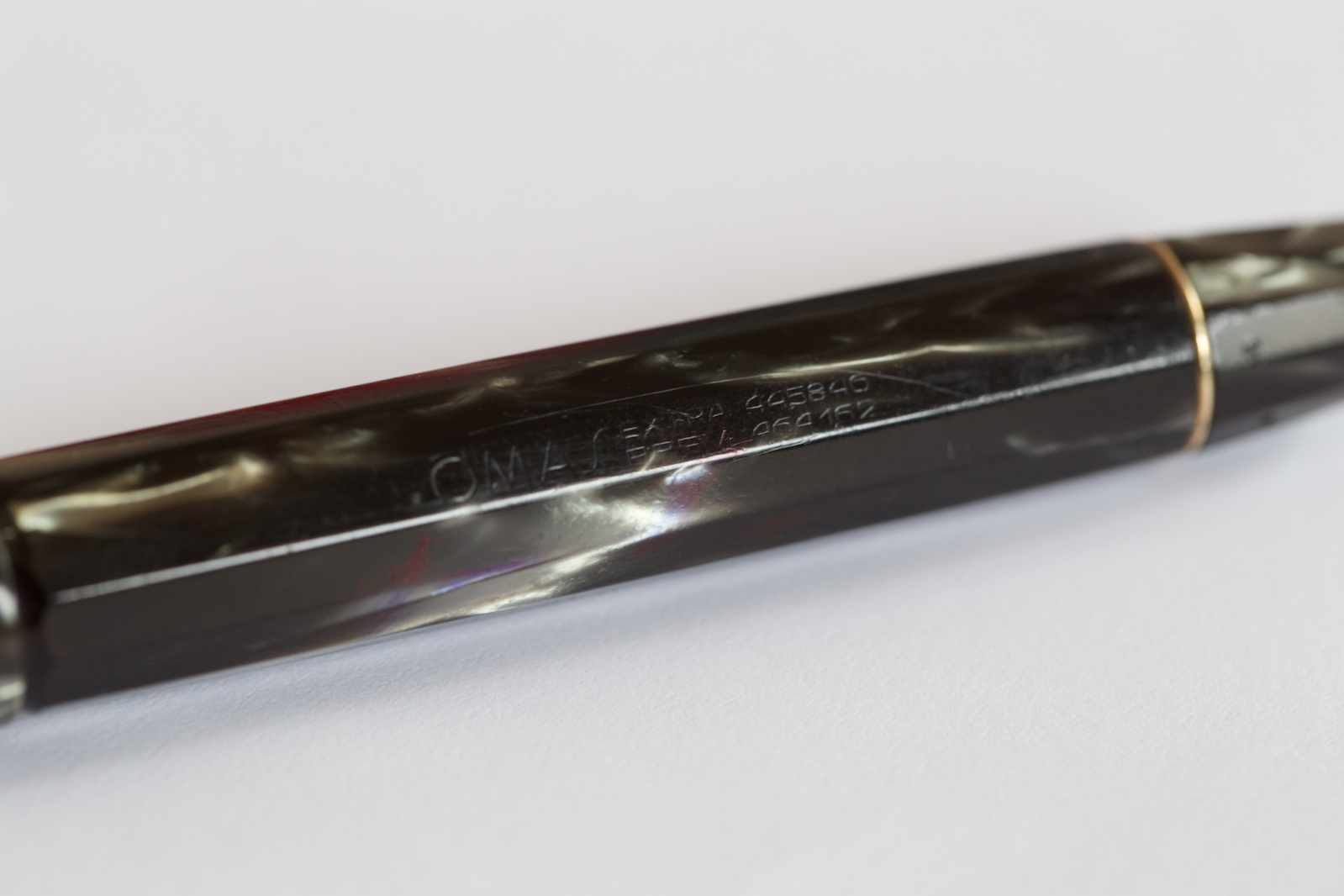 Buongiorno, vi presento uno degli ultimi arrivi, una bellissima Omas extra variegata nella misura media corrispondente a una 556-F. La daterei attorno agli anni cinquanta, misura da chiusa 13,5 cm., alimentatore in ebanite, pennino Omas Extra Lucens di misura finissima e super flessibile. Ho dovuto allargare un po' i rebbi del pennino perchè erano appiccicati e non si poteva scrivere. Sorprendentemente il sughero tiene perfettamente e dopo una notte di carica con acqua aspira tutto l' inchiostro possibile. Questa variegata viene a fare compagnia all' altra extra che possiedo nel colore classico nero.