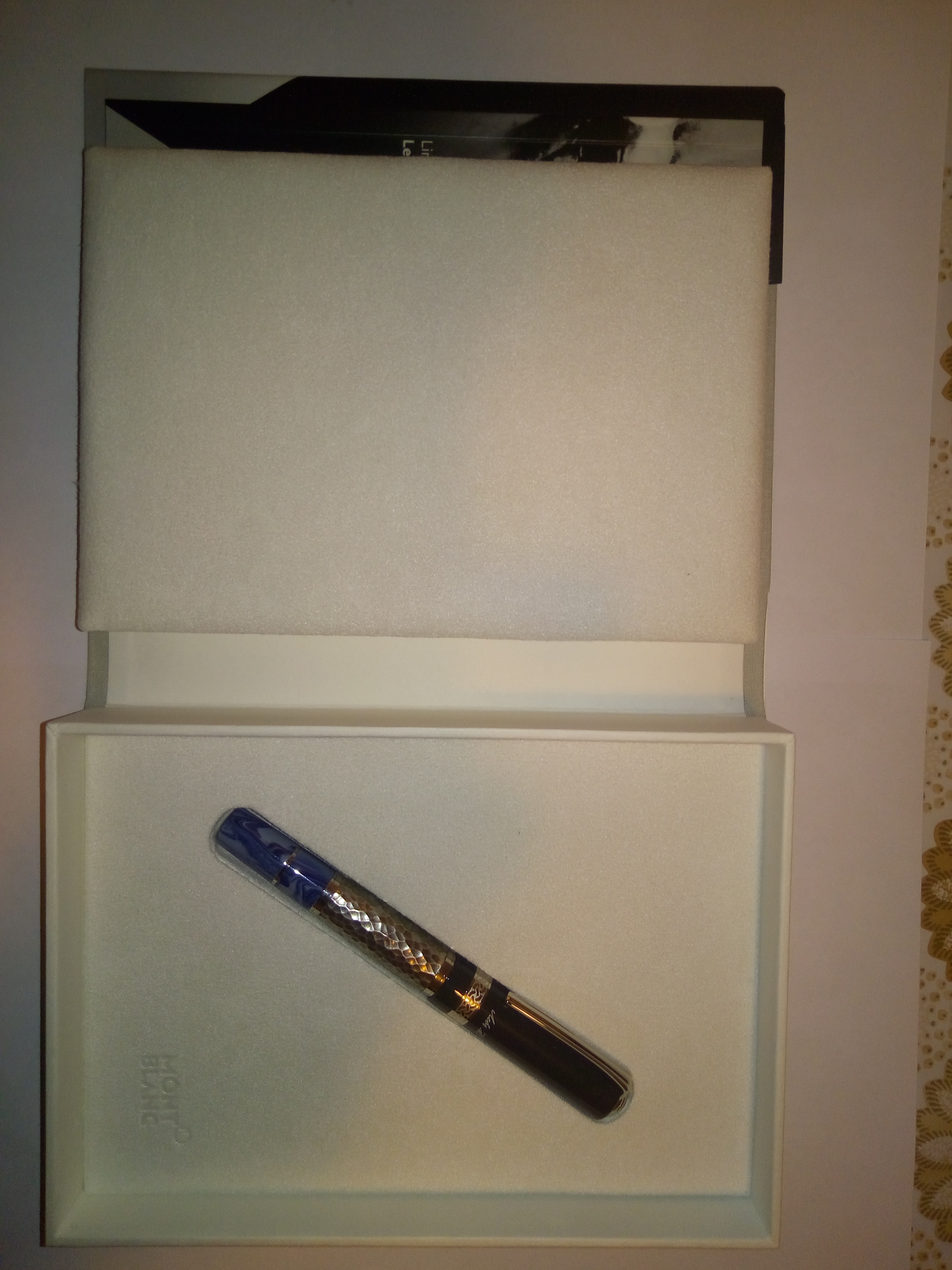 Ciao a tutti, oggi voglio darvi una piccola descrizione della Montblanc Lev Tolstoj. La Montblanc, per assicurare la limitatezza delle unità, una volta terminata la produzione distrugge gli strumenti necessari alla produzione del modello e garantisce la disponibilità dei ricambi in base alle penne prodotte. La penna fa parte della categoria delle edizioni limitate, writers edition 2015, ed ė stata prodotta in 9000 pezzi. La penna ė custodita all'interno della sua custodia composta da controscatola e dalla scatola a forma di libro dove vi sono contenuti garanzia, libretto illustrativo dedicato allo scrittore Tolstoj ed alla sua vita, dove all'ultima pagina vengono riportati i dati della penna. Ogni volta che si impugna la penna ci si rende conto del suo peso e dimensioni che vanno sicuramente oltre la media, caratteristiche che comunque non influiscono sulla maneggevolezza della penna. Il suo design appare molto originale. Il cappuccio ė in resina pregiata grigia, il corpo della penna si presenta con una rifinitura argentata battuta artigianalmente, mentre la parte terminale ė in resina di colore blu marmorizzato. Un cromatismo che non passa inosservato. Il pennino ė costruito in oro massiccio 18k con inciso lo stemma familiare del Tolstoj. Utilizzando la penna la scrittura appare molto fluida e piacevole, a tratti un pochino marcato sul foglio. Il pennino ė un M, riscrivendo su della carta con grammatura 160, invece, appare meno marcato e non crea problemi trapassando la pagina con l'inchiostro. In conclusione la penna si presenta con una ottima qualità costruttiva e un bellissimo impatto visivo. Io personalmente non mi pento dell'acquisto, ma il prezzo rimane un po' proibitivo.