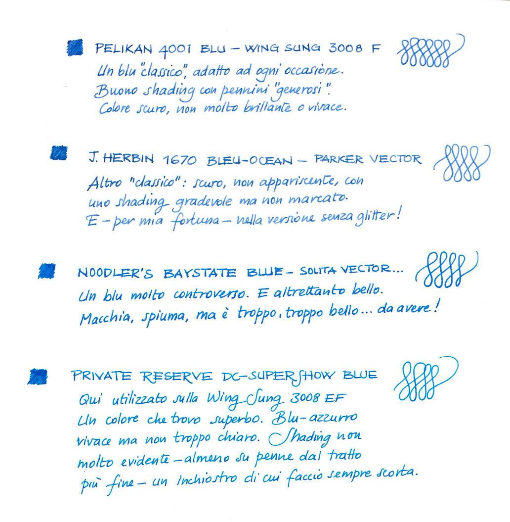 I miei preferiti al momento sono il J Herbin 1670 Bleu Ocean - la prima versione, quella prodotta dal 2012 al 2015, rigorosamente senza glitter - il Cobalt Blue di Levenger e il Private Reserve DC Supershow Blue.