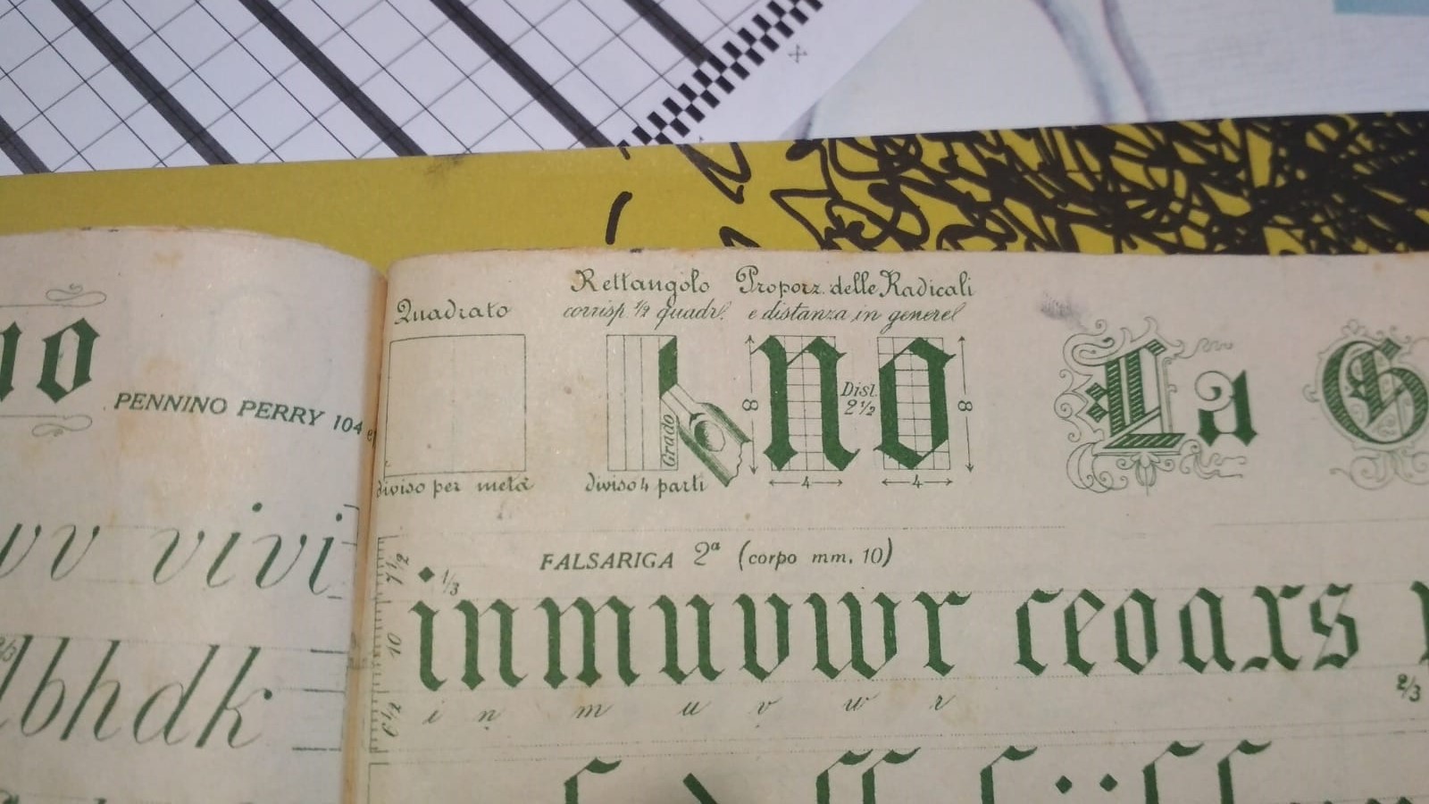 Notate come viene rappresentato il grado calligrafico e come emerga proprio da questa immagine la rilevanza che ha, come unità di misura, per definire le proporzioni dello scritto.
