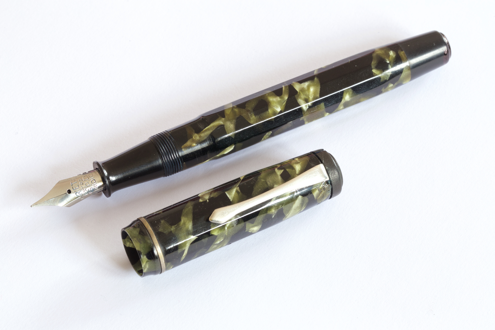 Buongiorno Forum, qualche giorno fa sono incappato in questa, a mio parere, bella penna in celluloide. Non c' è alcuna iscrizione sulla penna, la carica avviene tramite pulsante di fondo, monta un generoso pennino marchiato "Ariete" di cui non ho trovato alcuna notizia. A mio parere la sezione non è la sua in quanto non riesce ad entrare nel controcappuccio lasciando il cappuccio avvitato solo in parte. Il pennino in acciaio è estremamente flessibile ed è molto piacevole scriverci. Qualcuno ha qualche notizia su questo Ariete?