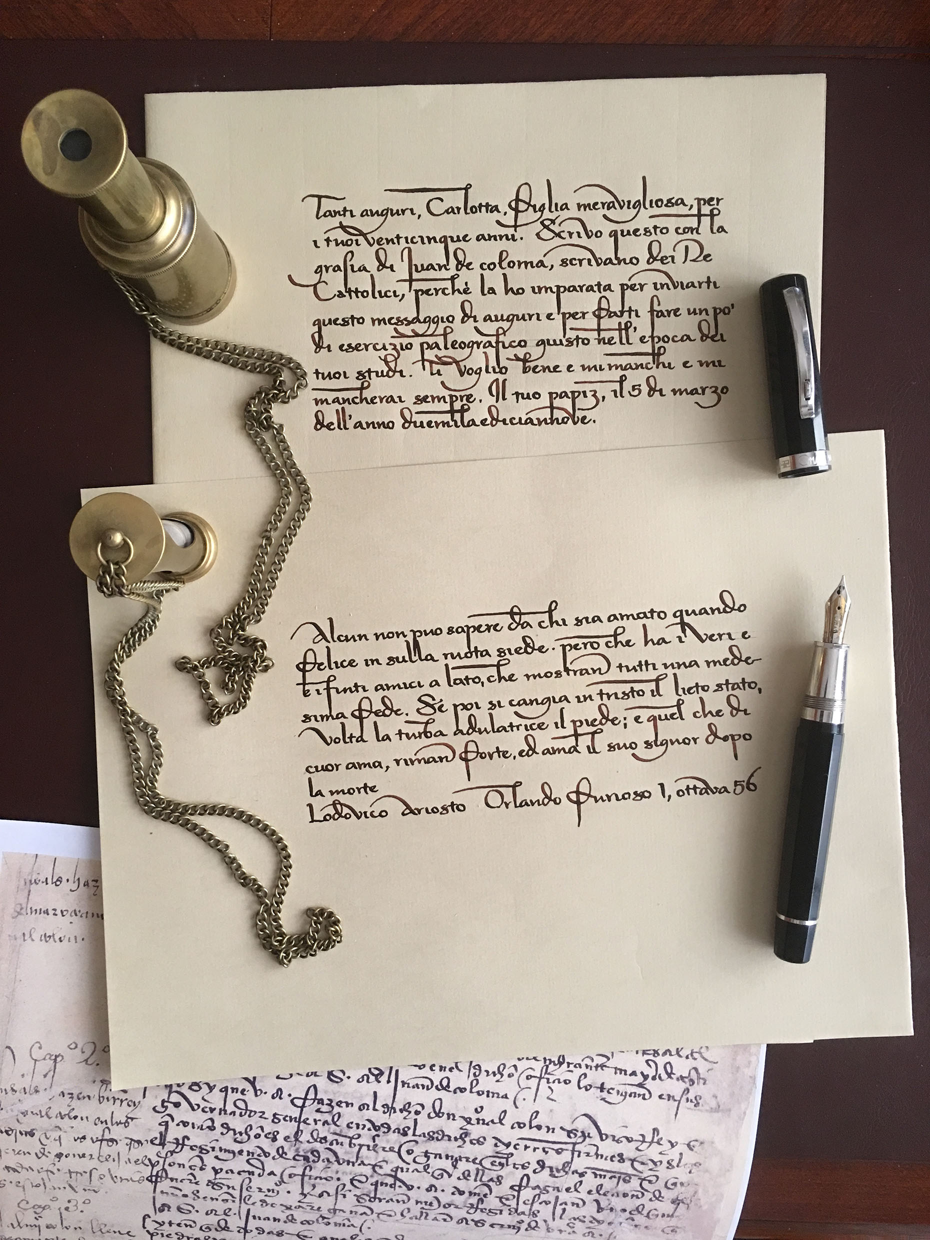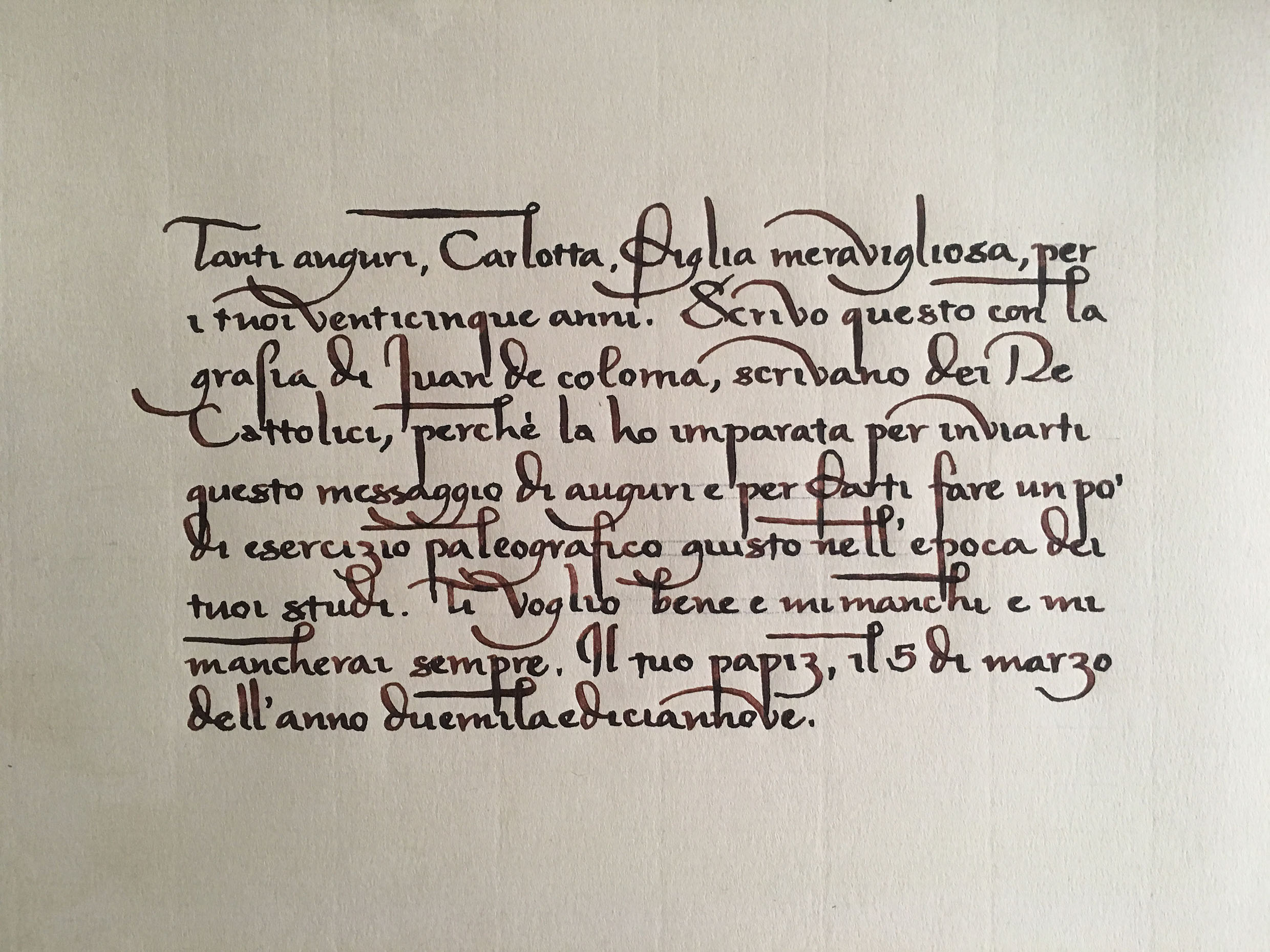 Ora che avevo un alfabeto “colomesco” a mano, volevo provarlo con un testo scritto in italiano. Prima di tutto, un messaggio di auguri per il compleanno di Carlotta, con una grafia della Spagna dei Re Cattolici, perfetta per i suoi studi sulla musica di quell’epoca. Poi, qualcosa di letterario e coevo (o quasi). Ho dunque copiato alcune righe dell’Orlando furioso, che Ariosto cominciò a scrivere tra il 1504 e il 1507, quando Juan de Coloma era ancora vivo.