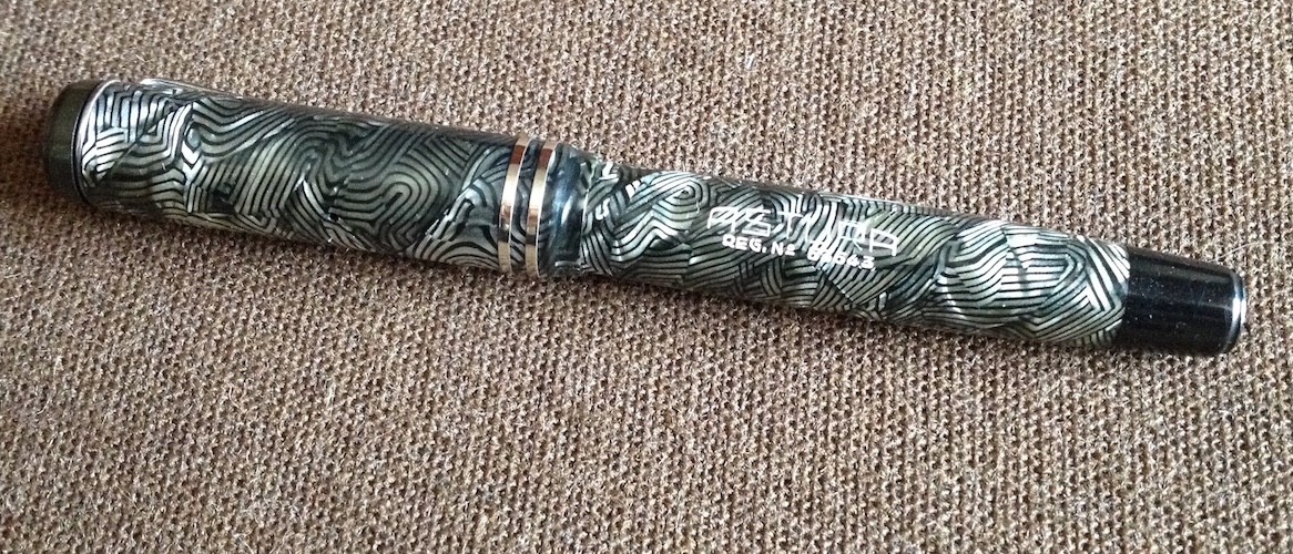 Questo invece è un recente acquisto, ancora in fase di restauro. Proveniente dal banchetto di un mercatino, è il classico esempio di oggetto che spunta in mezzo alla massa: quelle striature ammalianti non potevano giacere in mucchio di rottami. E così questa Astura, prodotta dalla torinese SAFIS poco prima del secondo conflitto mondiale stando al numero del brevetto, è tornata a luccicare. Il Micro-mesh è stato eccellente sulle verette, paiono nuove. La clip invece presenta ancora qualche traccia di ossidazione. Lunga 11,5 cm, ha il fusto del diametro di 11mm. Di suo presentava un pennino Condor extra n°4 (della Pagliero ?) piegato a 90° in punta. Ho cercato di fare del mio meglio, alla prova scrittura (intinto) mi pare si sia comportato bene, che dite ? Lascerà il posto ad un Astura Nova iridium n°4 placcato.