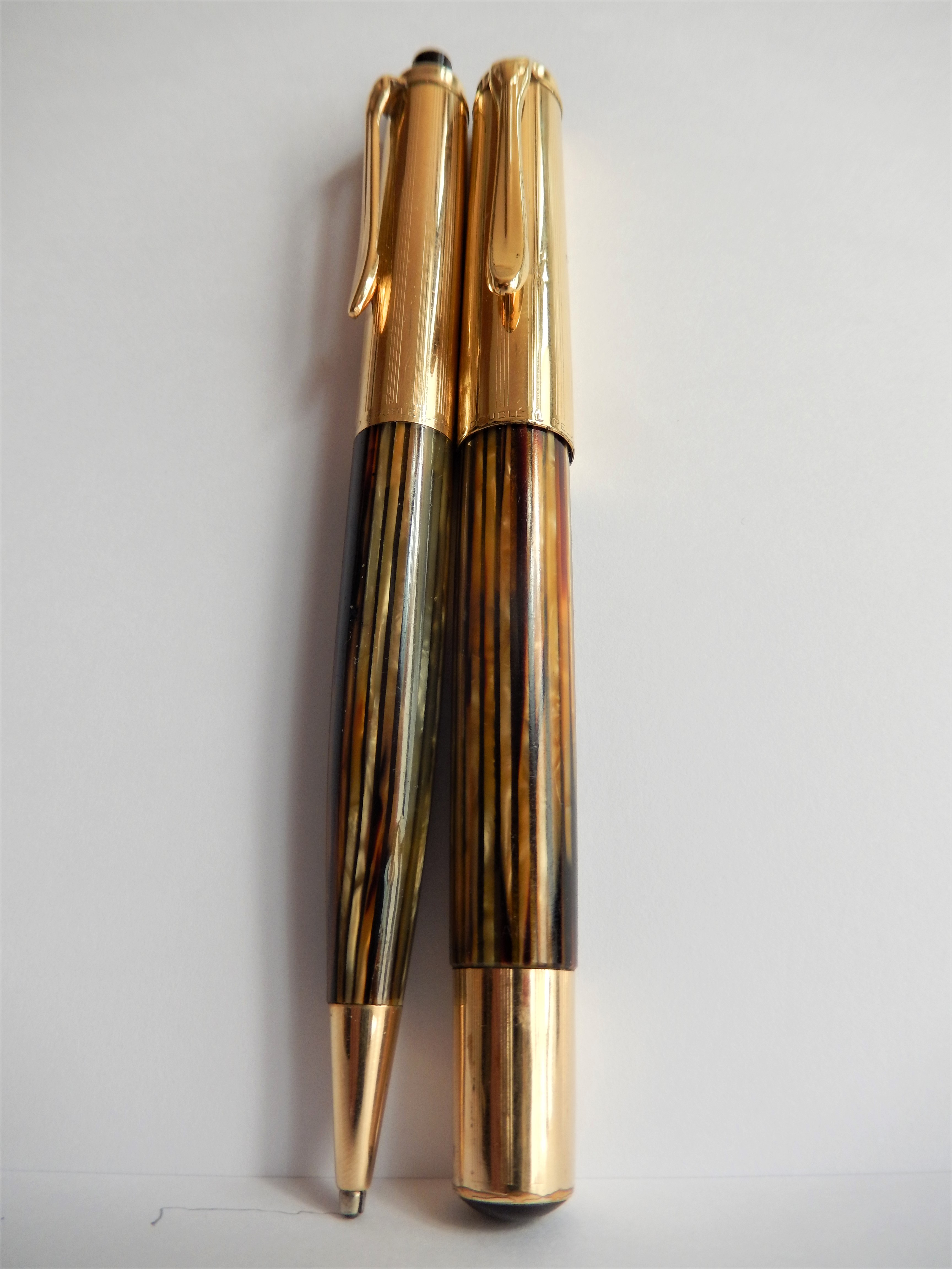 Qui vediamo un set composto da una stilo 500 ed una matita 550. La 500 fu in produzione dal 1950/1951 fino al 1955. quella in presentazione è della colorazione definita in catalogo "Schildpatt" ( tortoise), ma ne venivano prodotte anche in nero, in un tortoise più chiaro, in un grigio rigato ed anche in un più raro, prodotto solo per un anno, colore "sea green stripped". La penna è lunga 12,6 cm e pesa 17 grammi, dunque circa 1,7 grammi più della 400, maggior peso che a mio parere nulla toglie ad un ottimo bilanciamento , anche con il cappuccio calzato. Particolarmente capace il serbatoio, circa 2 ml.