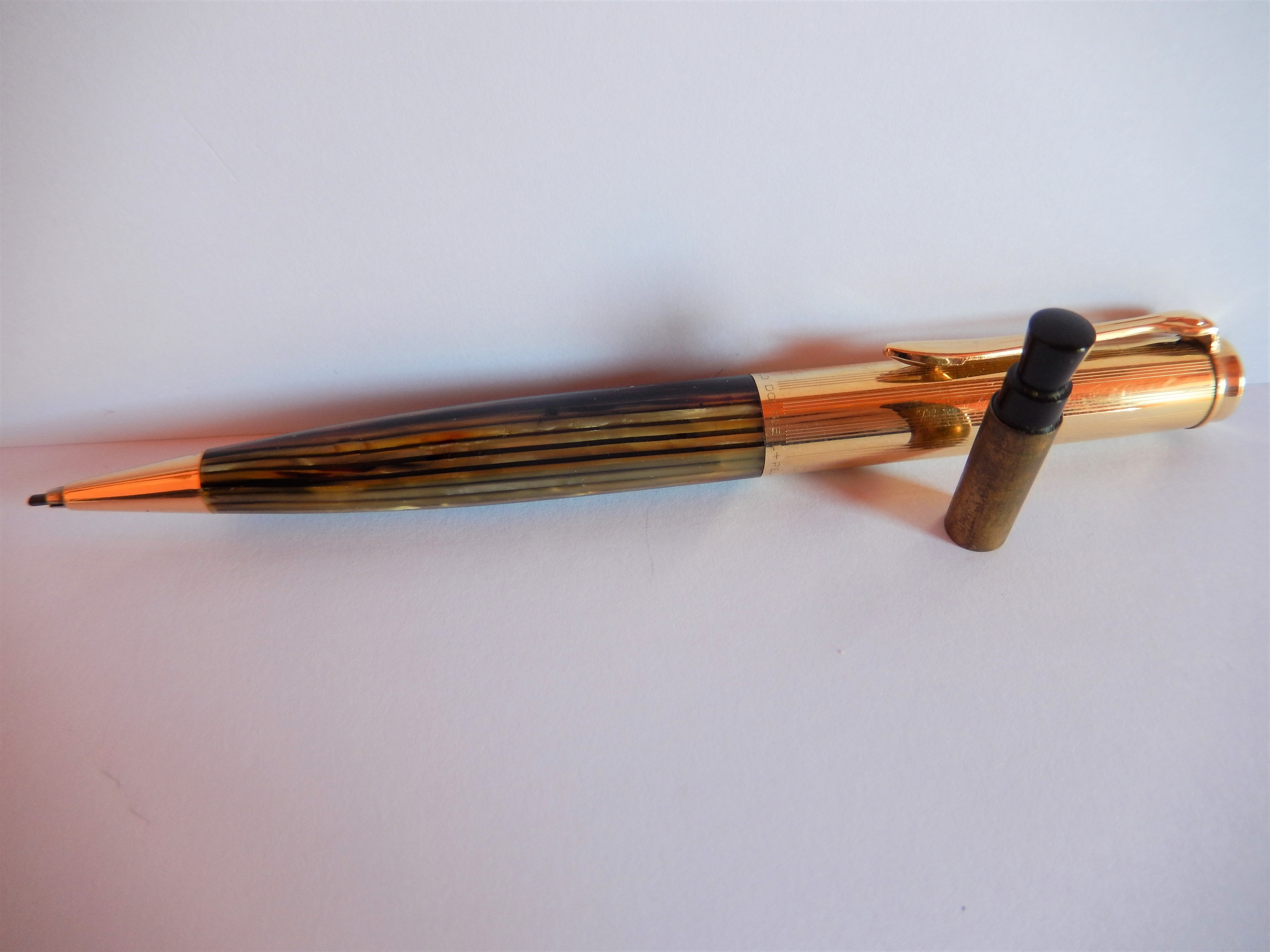 con una assoluta scorrevolezza. La matita, una 550, è lunga 12,8 cm , come segnala il catalogo del 1953, mentre il catalogo del 1955 indica una lunghezza di 13,1. Sul labbro del cappuccio riporta " Pelikan Germany rolled gold double L, con double scritto stavolta senza accento. Il meccanismo è azionato dal pulsante superiore, rimovibile per avere accesso ad una gomma da cancellare in un involucro di ottone.