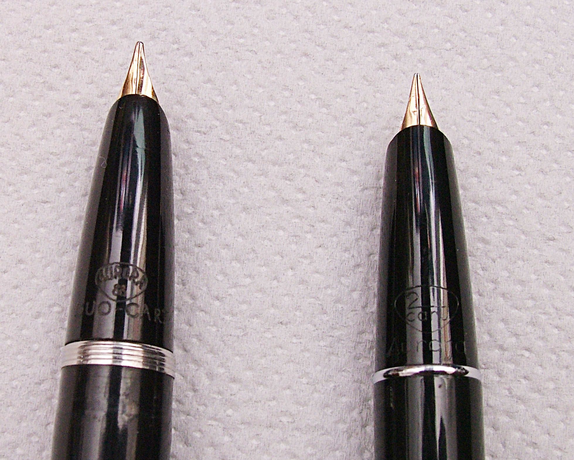 La seconda ha una spianatura in stile Aurora 98 al fondo della sezione, davanti al pennino. La prima, a parte il.pennino in acciaio, ha una sezione molto simile ad una 888.